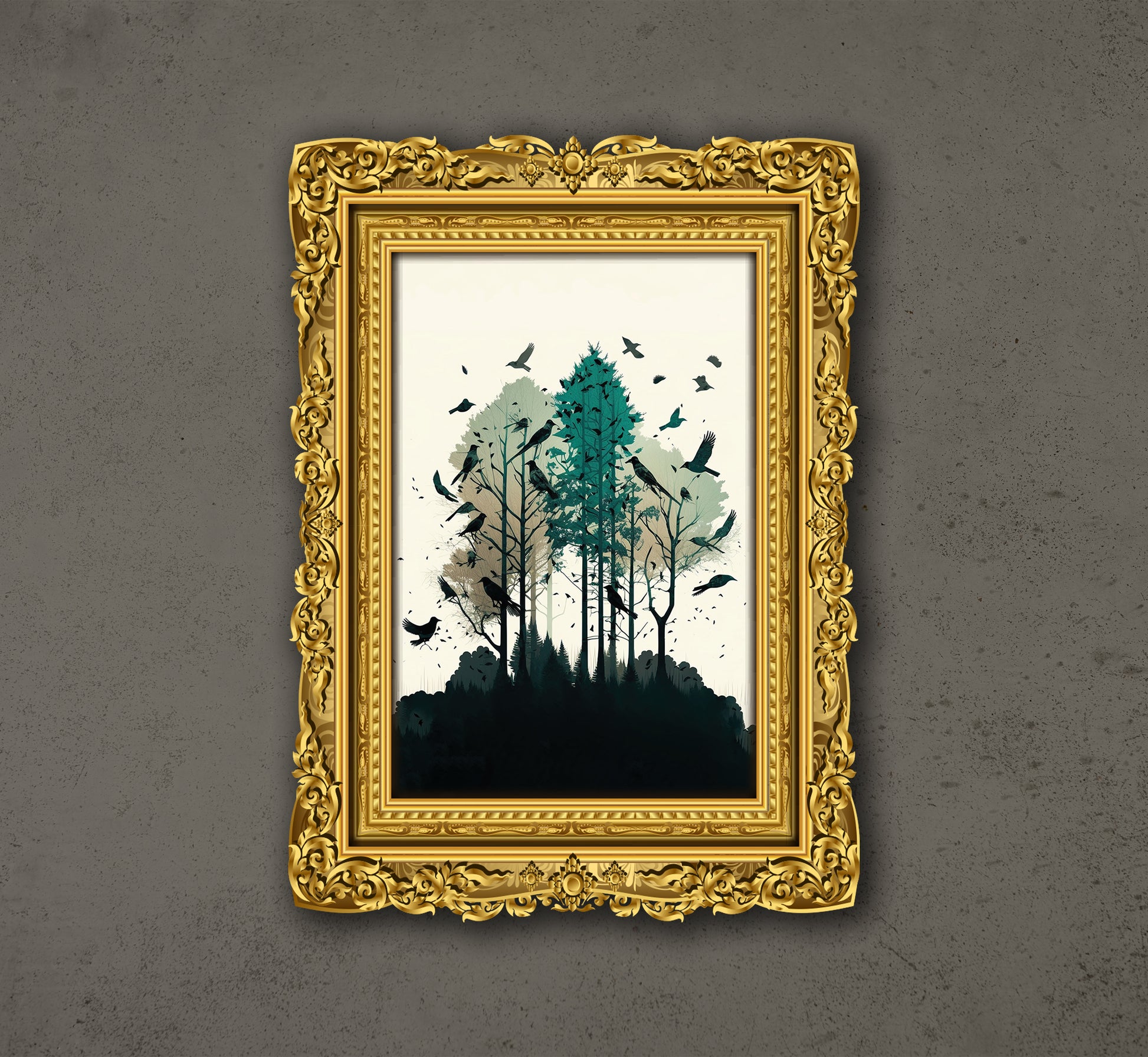 This is a digital artwork depicting a stylized forest scene, framed in an ornate gold frame. The artwork features a cluster of tall, slender trees with teal and dark green foliage, silhouetted against a light background. Several birds are scattered throughout the trees, adding a sense of movement and life to the scene. The frame itself is highly detailed, with a baroque-inspired design and a rich gold finish, creating a striking contrast with the simplicity of the forest scene.