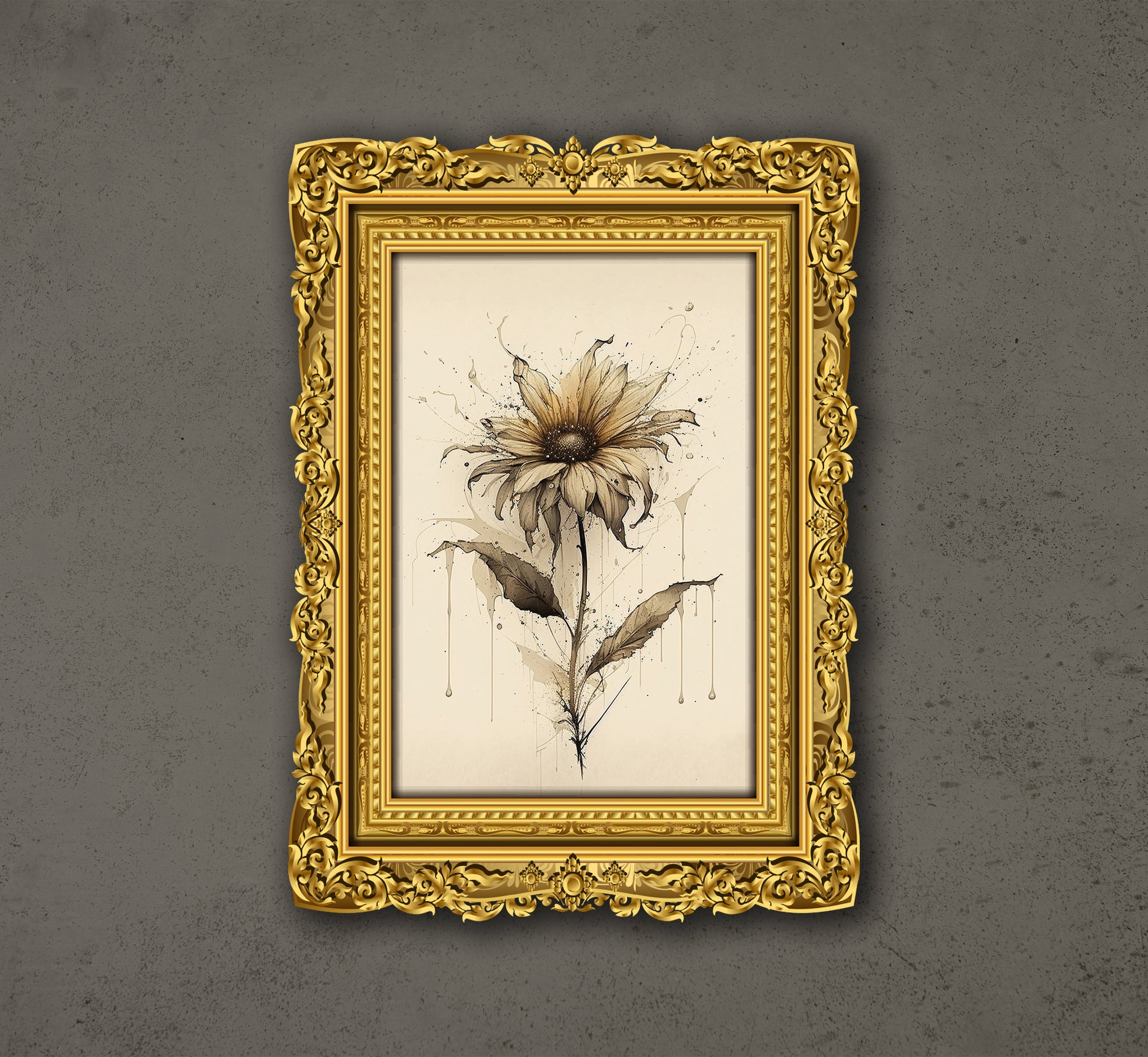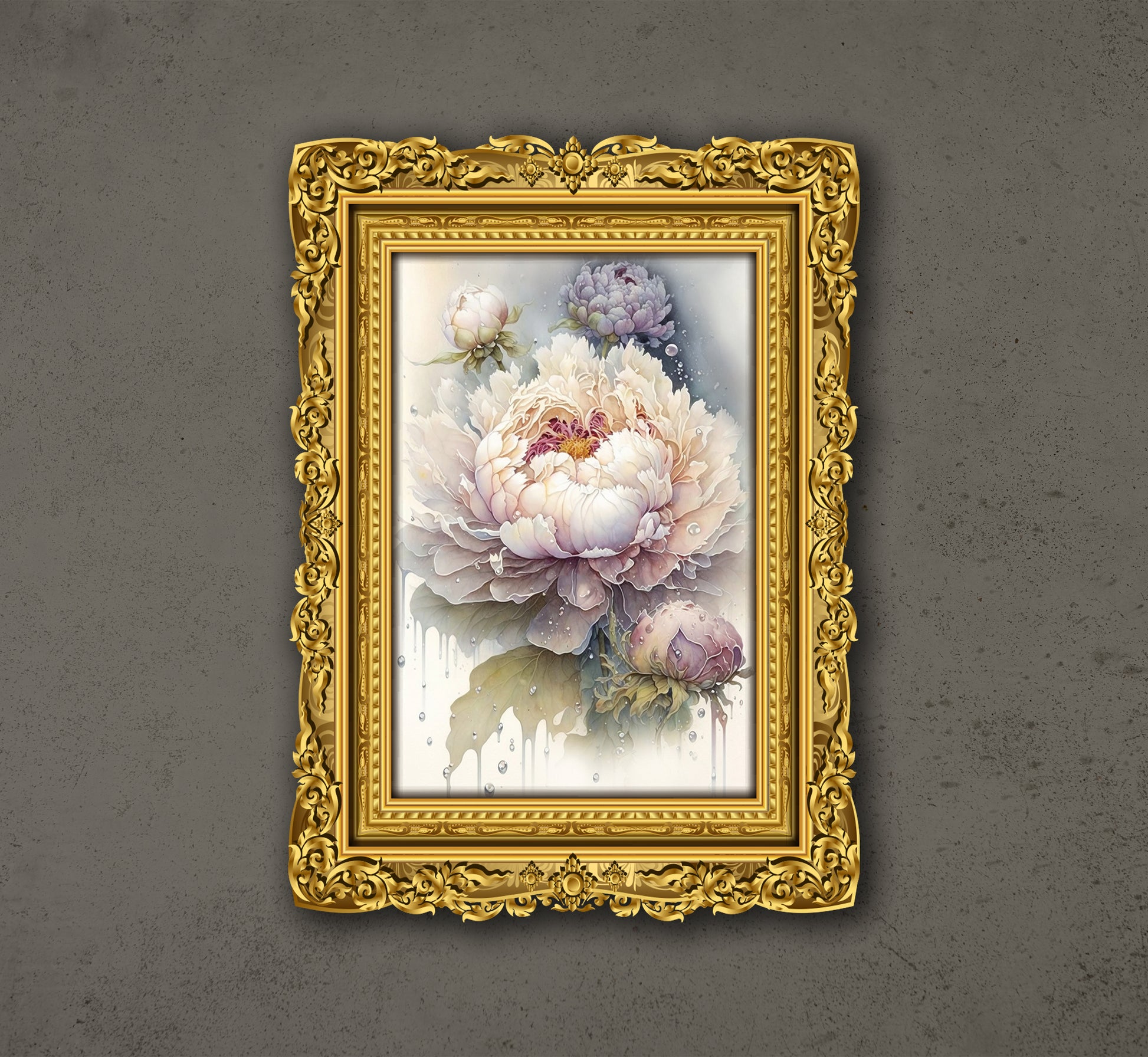 This is a digital artwork depicting a stylized flower, framed in an ornate gold frame. The flower, with its delicate petals and vibrant colors, is rendered in a mix of watercolor and digital techniques, creating a sense of depth and texture. The frame itself is highly detailed, with a baroque-inspired design and a rich gold finish, creating a striking contrast with the simplicity of the flower and its natural beauty.