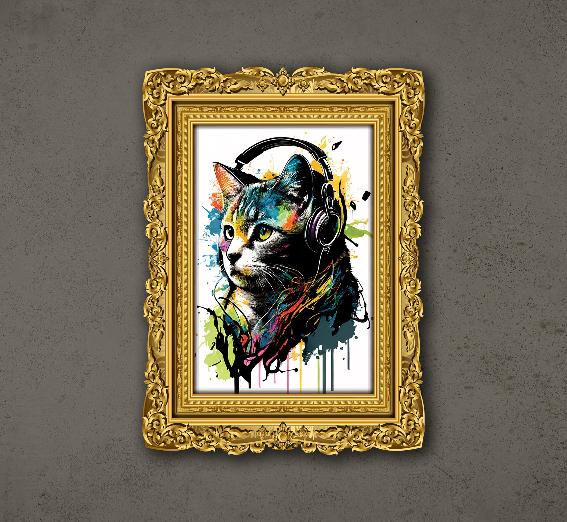 This is a digital artwork depicting a stylized cat head, framed in an ornate gold frame. The cat, with its expressive eyes and whiskers, wears a pair of eyeglasses and headphones, its fur rendered in a mix of colorful hues and abstract patterns. The frame itself is highly detailed, with a baroque-inspired design and a rich gold finish, creating a striking contrast with the simplicity of the cat and its quirky accessories.