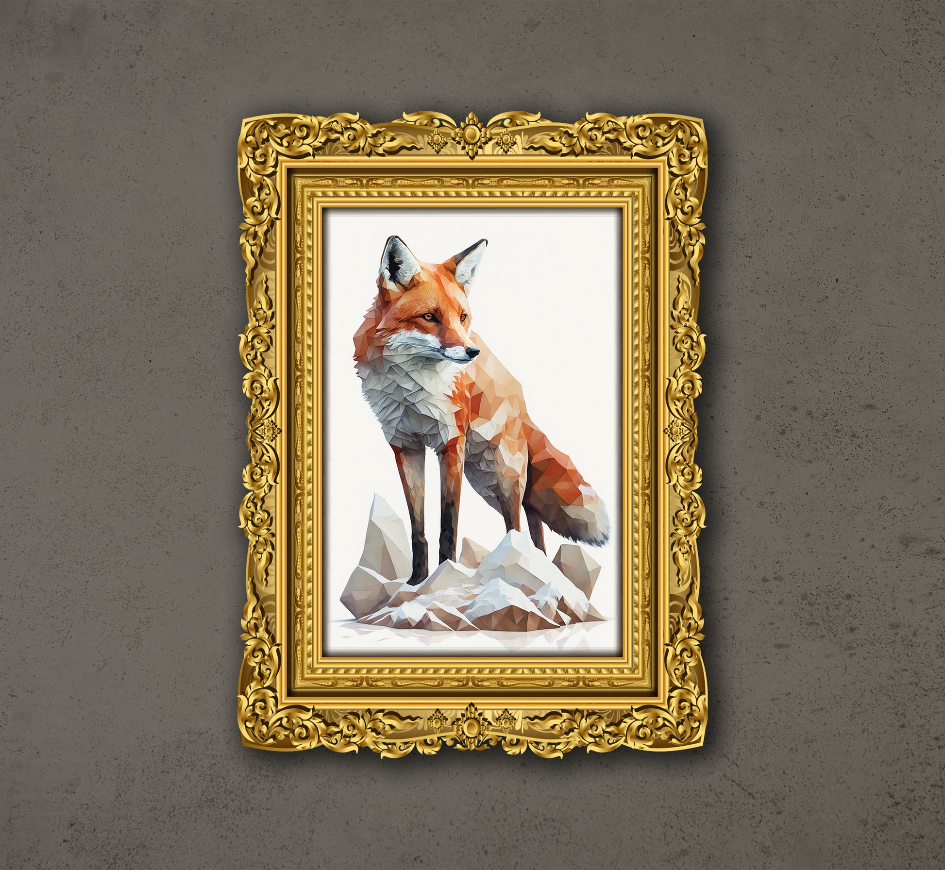 This is a digital artwork depicting a stylized fox, rendered in a geometric style and framed in an ornate gold frame. The fox, with its sharp features and piercing eyes, stands on a rocky outcrop, its fur rendered in a mix of orange and white hues. The frame itself is highly detailed, with a baroque-inspired design and a rich gold finish, creating a striking contrast with the simplicity of the fox and the geometric shapes that make up its form.