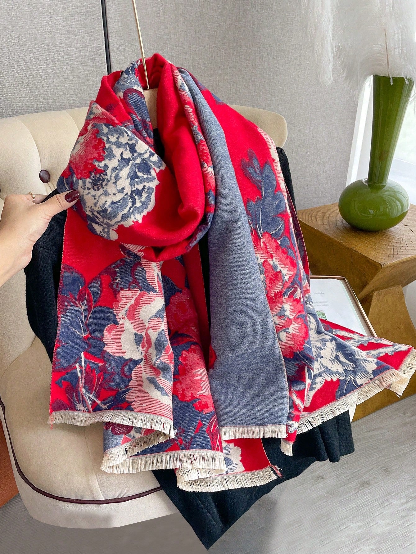 8. Chic Floral Jacquard Knit Shawl Scarf - Cozy Cashmere Feel for Autumn & Winter