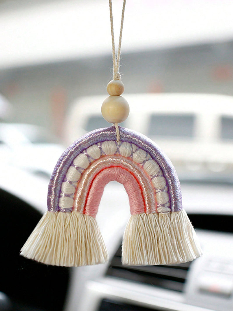 Enhance your car's interior with our Colorful Charm: Handmade Rainbow Woven Pendant. Handcrafted for a unique design, this pendant adds a splash of color to your rearview mirror. Made with vibrant woven materials, this pendant is the perfect accessory to brighten up any drive.