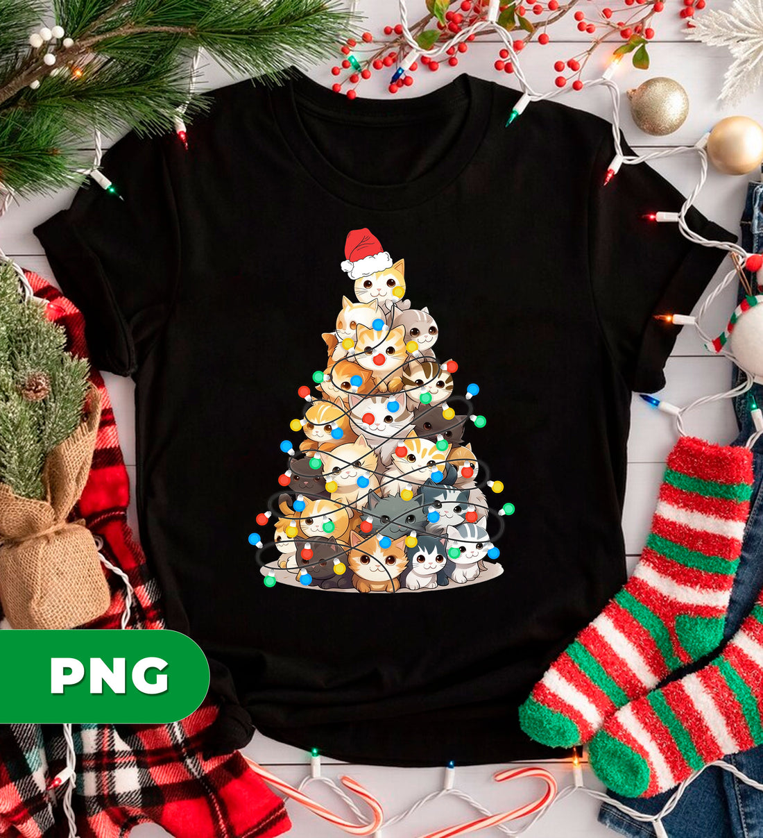 Cute Cat Christmas Tree PNG with Kittens Stacked in Tree Shape, Colorful Holiday Lights, Santa Hat, PNG For Shirts, PNG Sublimation