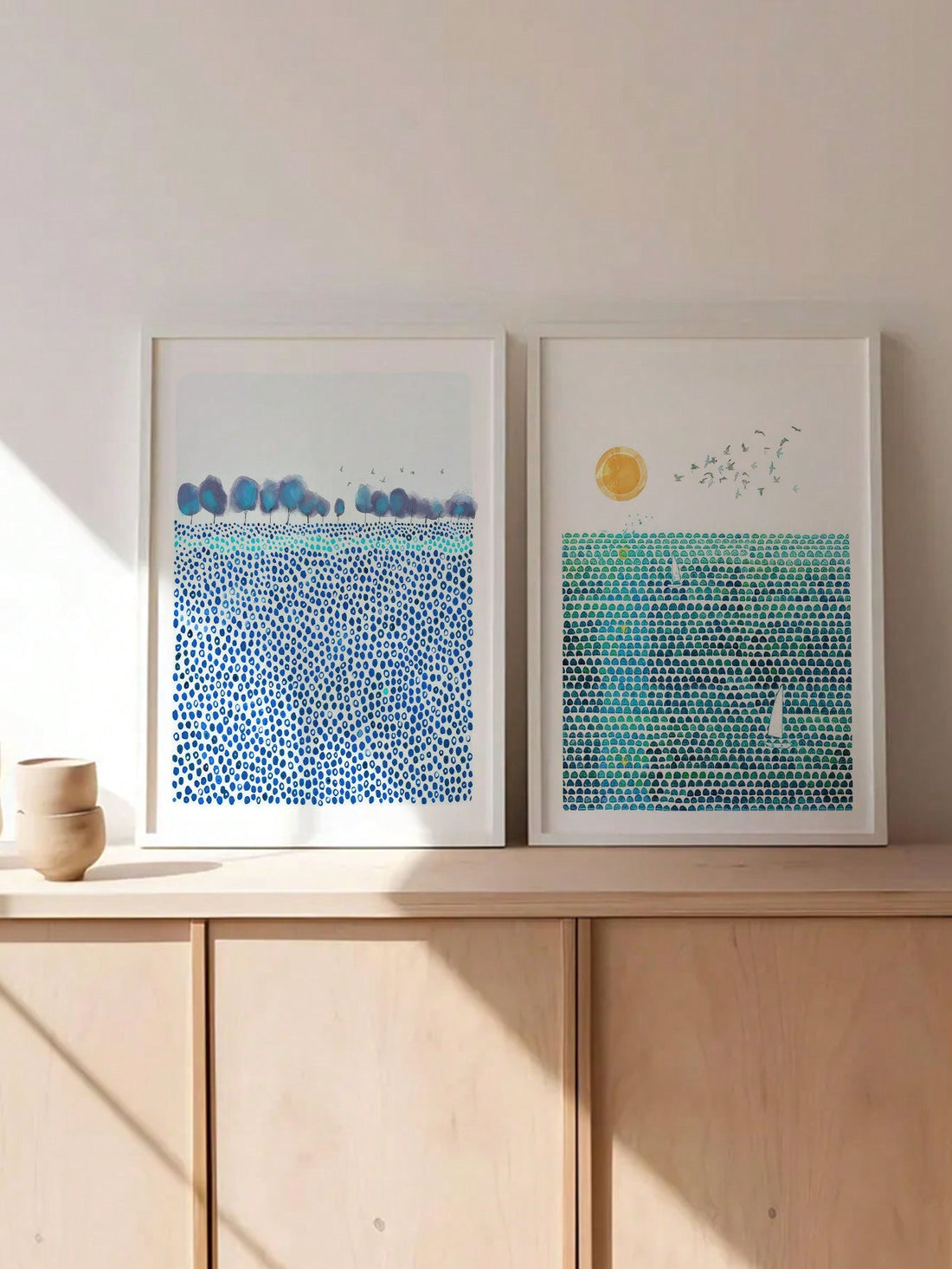 Serene Abstract Landscape Painting Featuring Four Elegant White Egrets Flying Over A Soft Blurry Green And Teal Water Scene