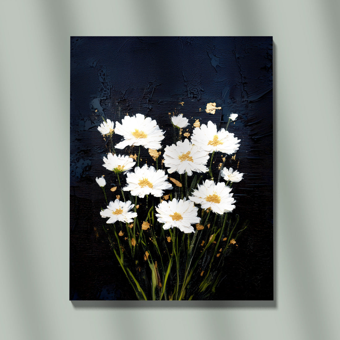 A visually dramatic and textural floral painting featuring a bouquet of large white daisy flowers...