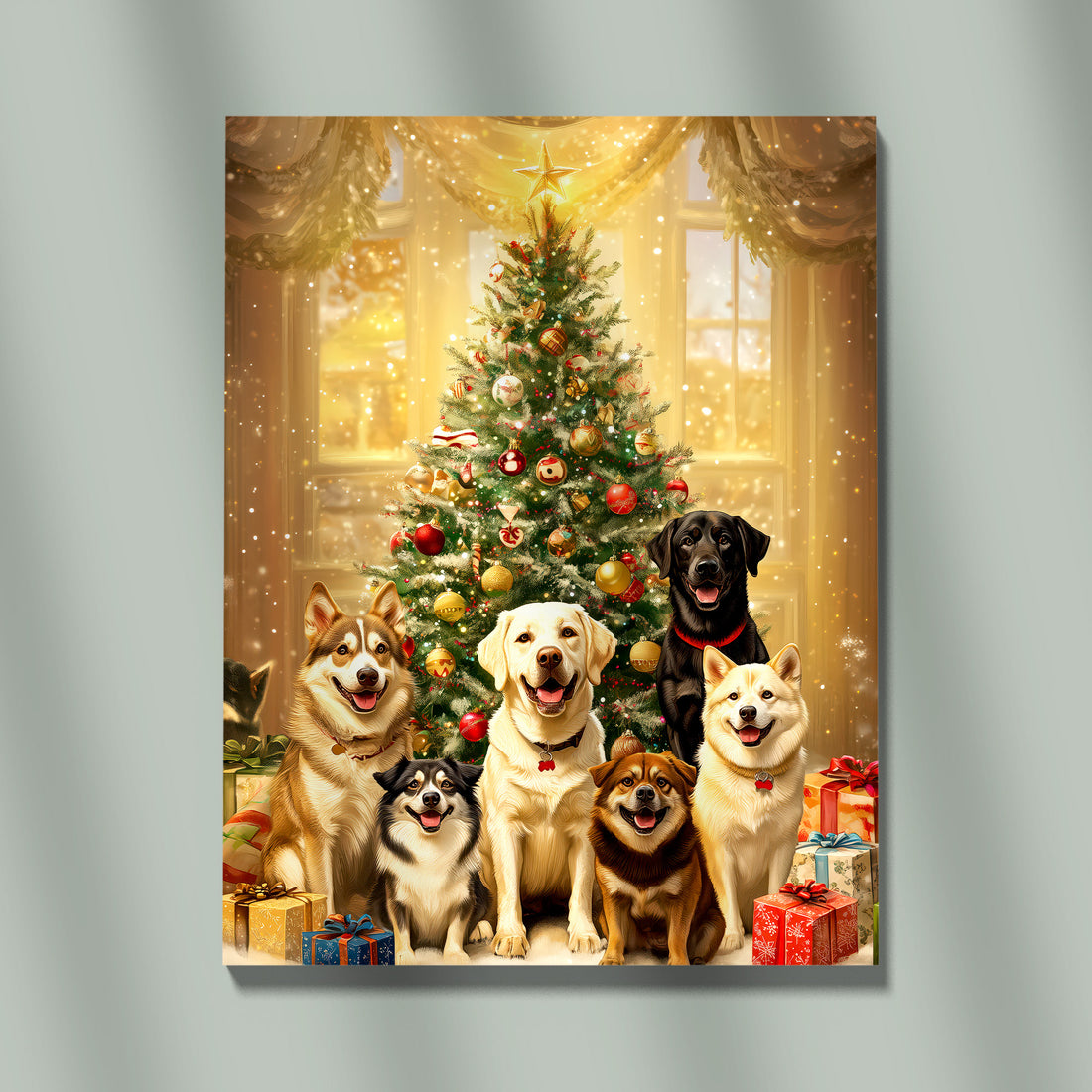 A festive and traditional digital portrait capturing a diverse group of six happy dogs (including...
