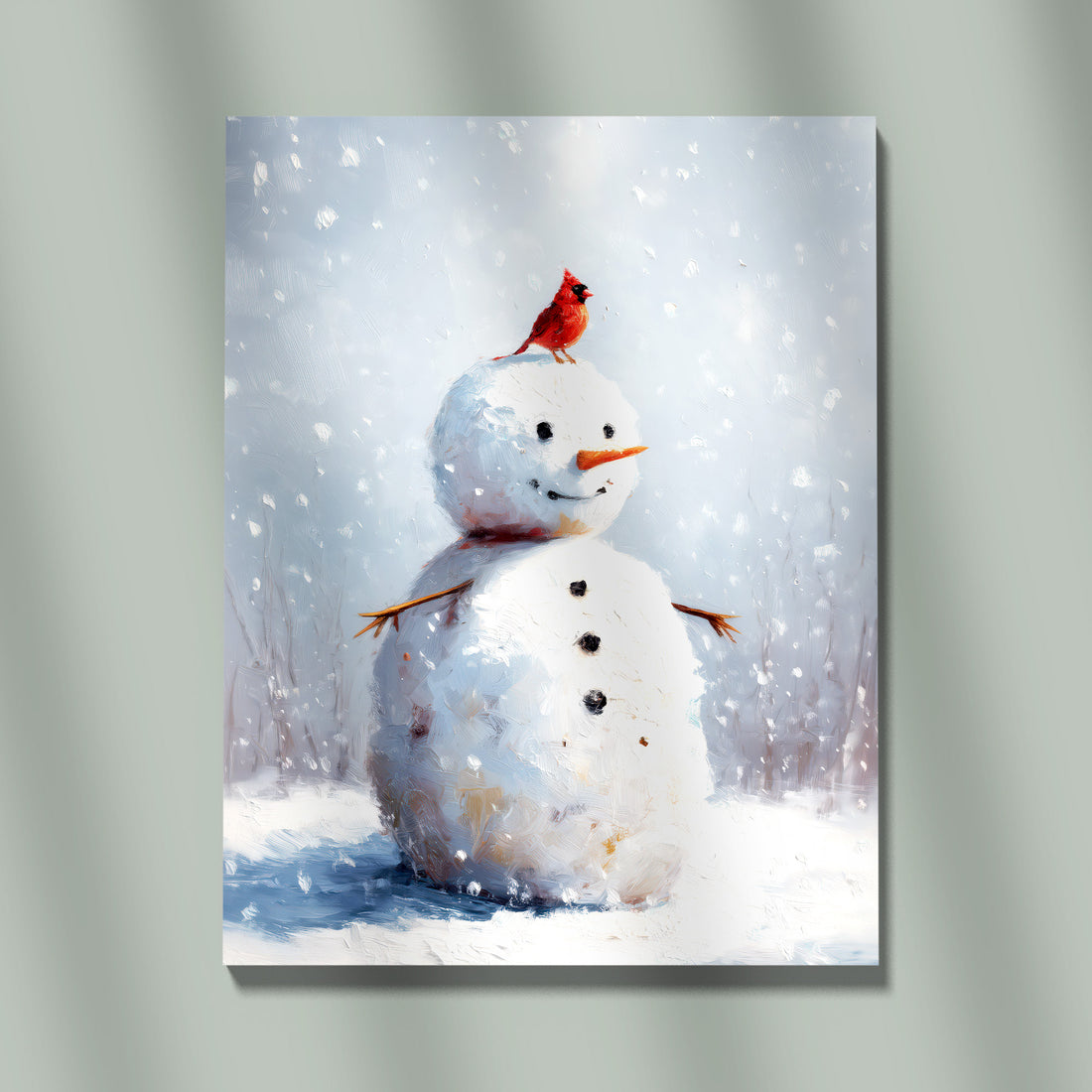 Impressionist Winter Painting Of A Happy Snowman Adorned With A Bright Red Cardinal Bird Against A Snowy Backdrop