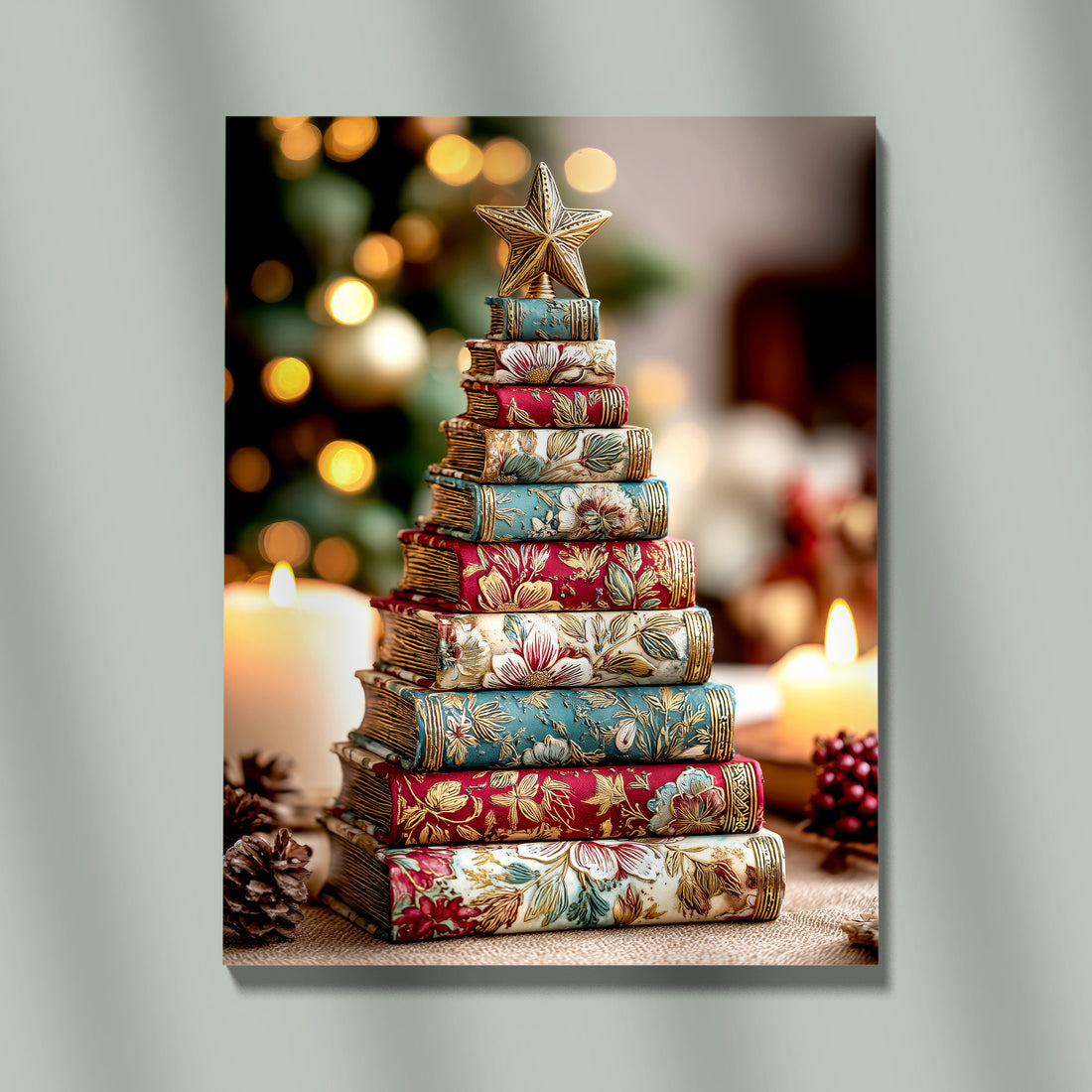 A unique and charming holiday digital illustration or photograph featuring a stack of beautifully detailed,...