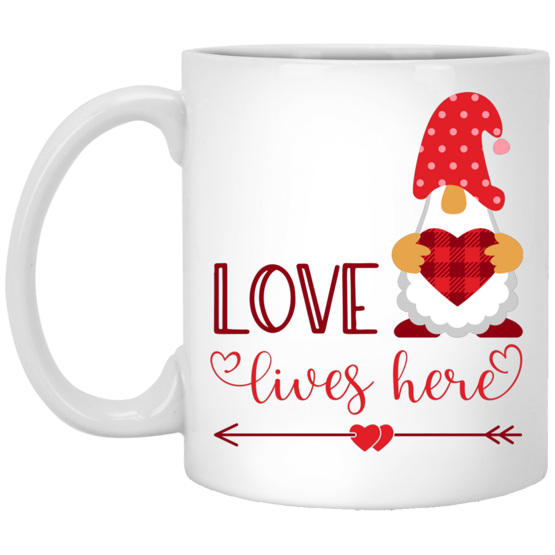 Love Lives Here, Loving Gnome, Cute Gnome, Valentine, Valentine's Day, Trendy Valentine White Mug
