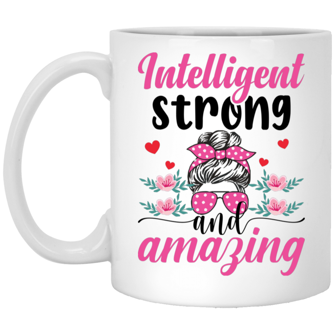 Intelligent Strong And Amazing, Messy Bun Girl, Pink Sunglasses, Valentine's Day, Trendy Valentine White Mug