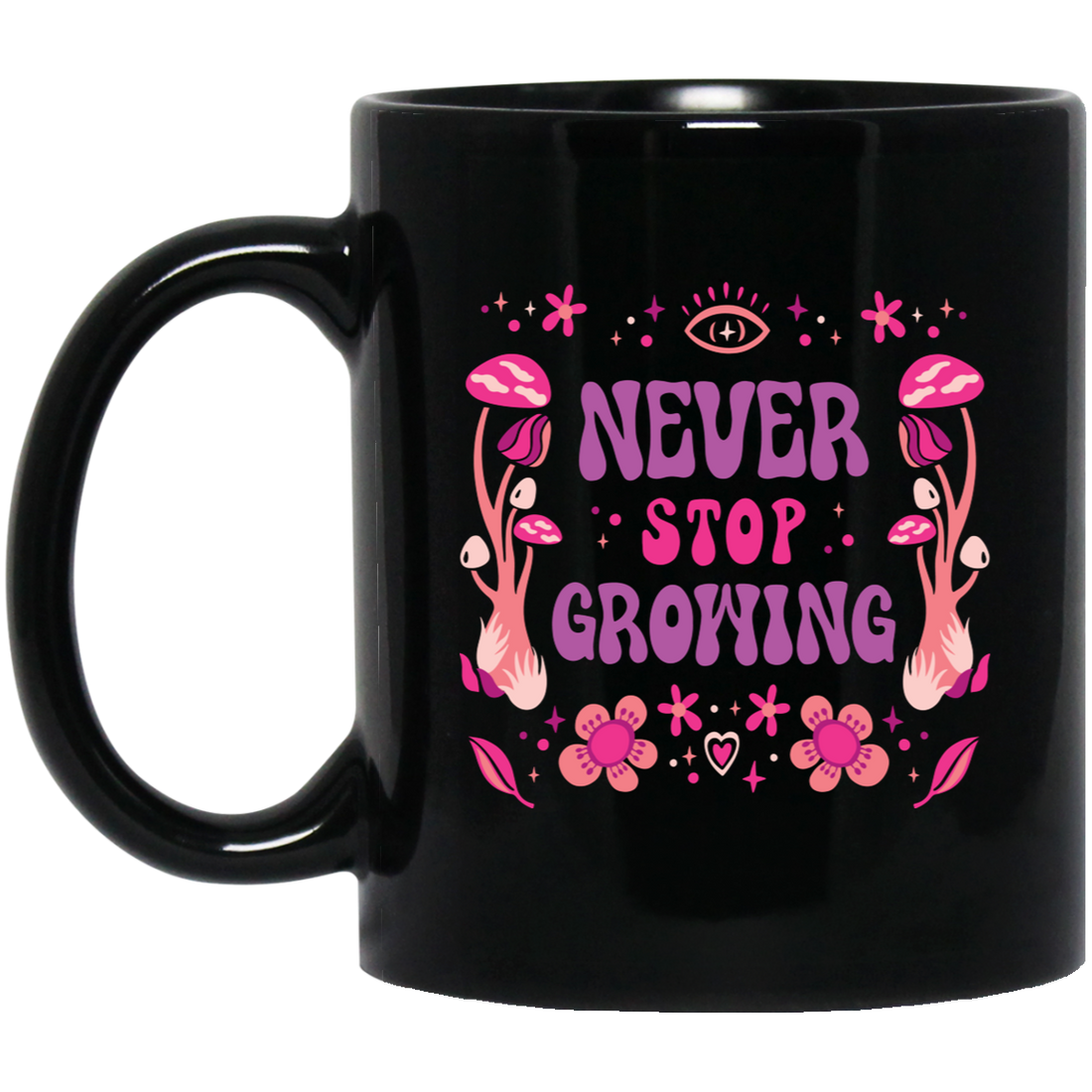 Never Stop Growing, Mushroom Groovy, Groovy Growing Black Mug