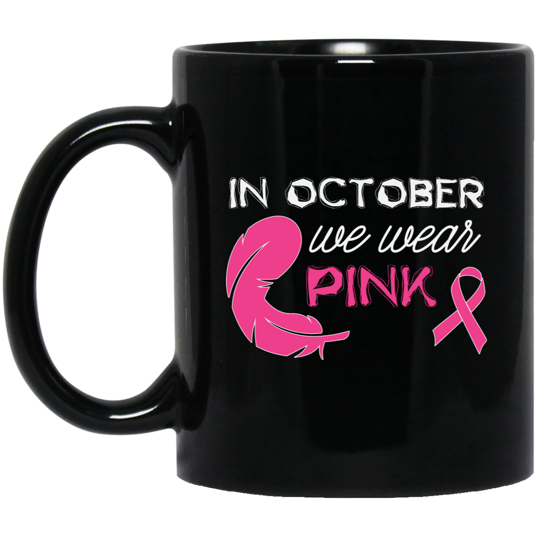 In October We Wear Pink, Cancer Awareness, Pink Ribbon, Cancer Ribbon, Pink Feather Black Mug