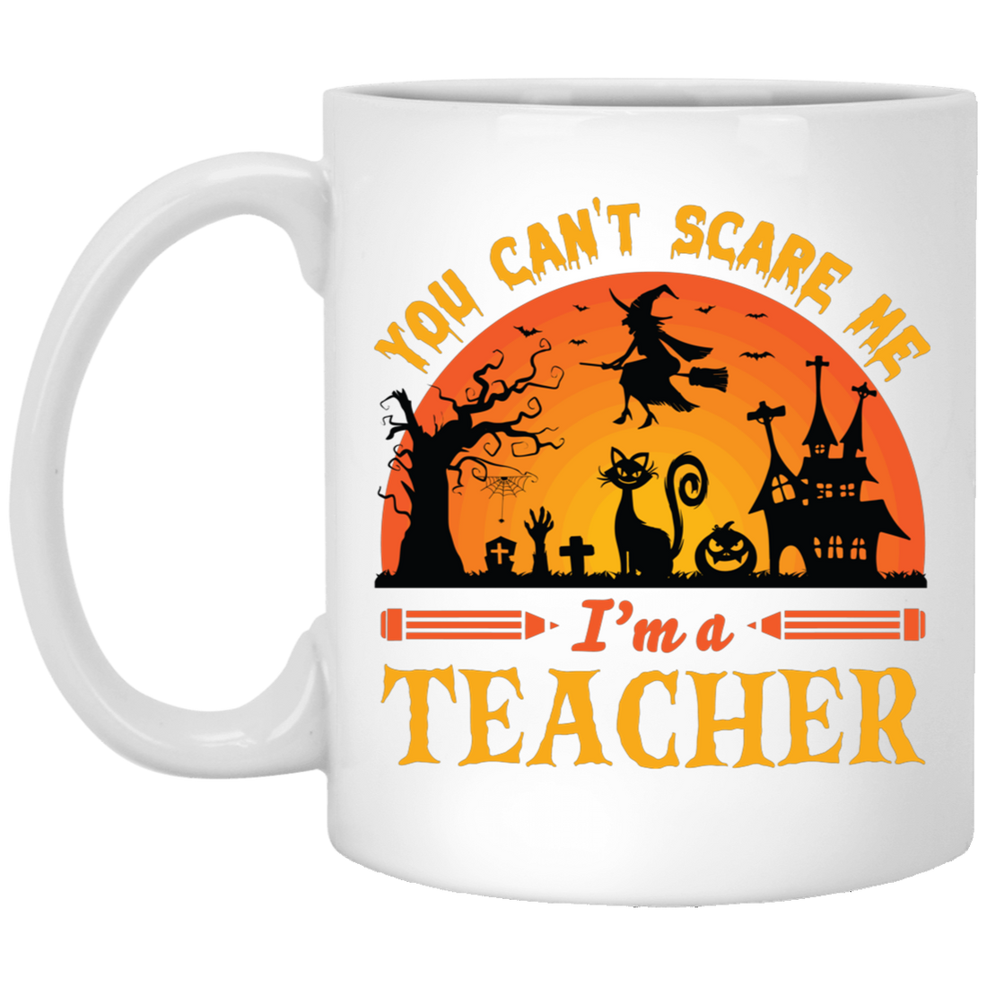 You Can't Scare Me, I'm A Teacher, Witch And Horror Cat White Mug