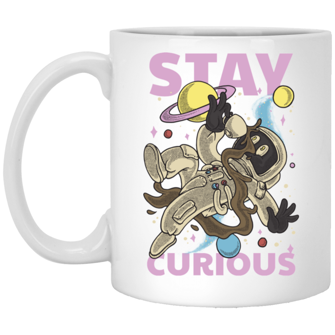 Astronaut Holding A Coffee Cup, Retro Astronaut, Stay Curious White Mug