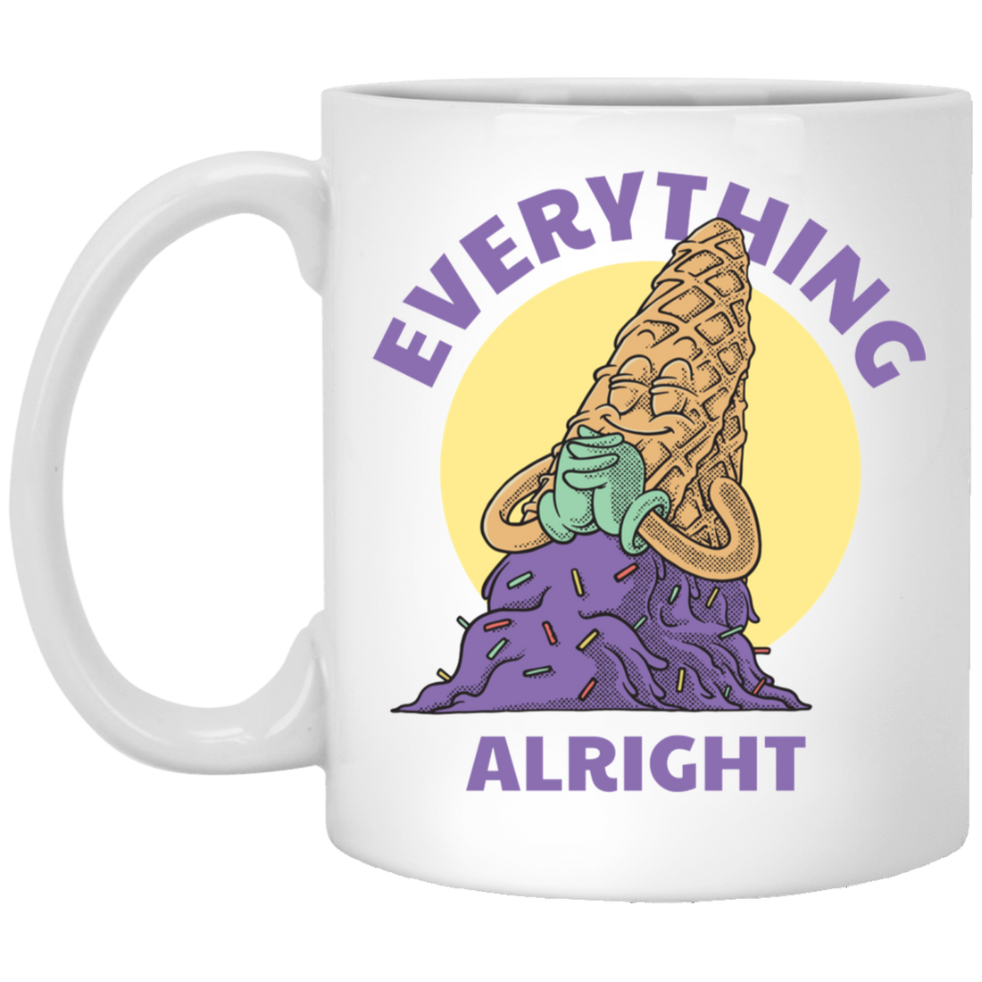 Everything Is Alright, Cartoon Smiling Spilled Ice Cream White Mug