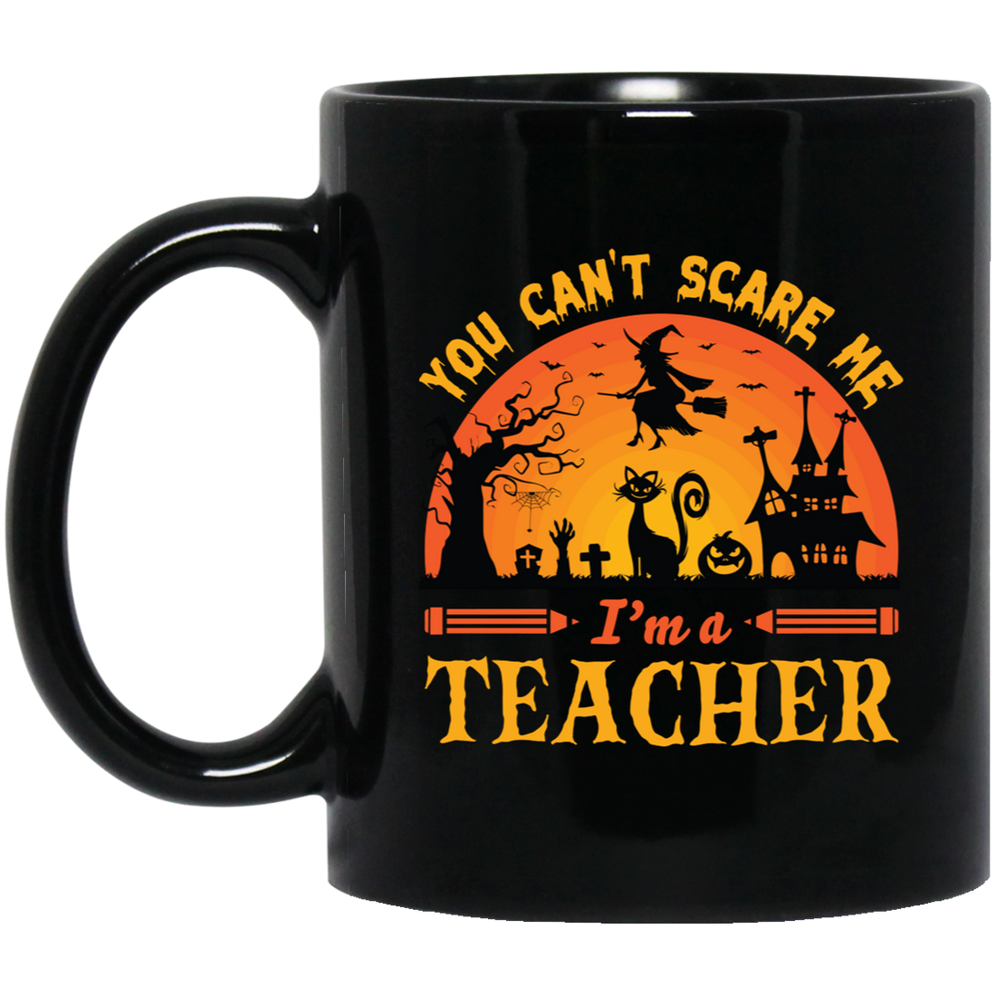 You Can't Scare Me, I'm A Teacher, Witch And Horror Cat Black Mug