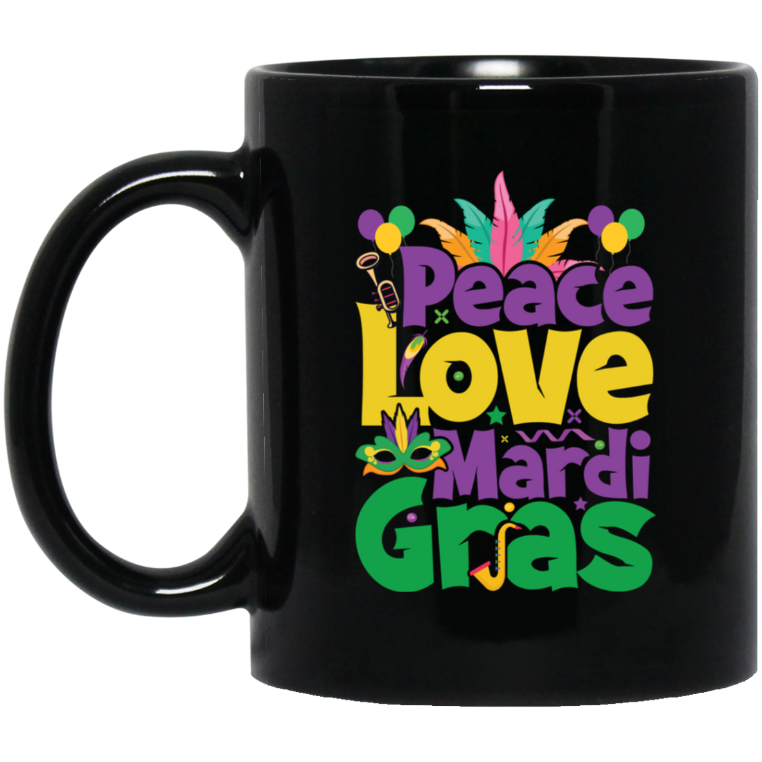 Peace Love Mardi Gras, Mardi Gras Holiday, Three Kings Day Black Mug