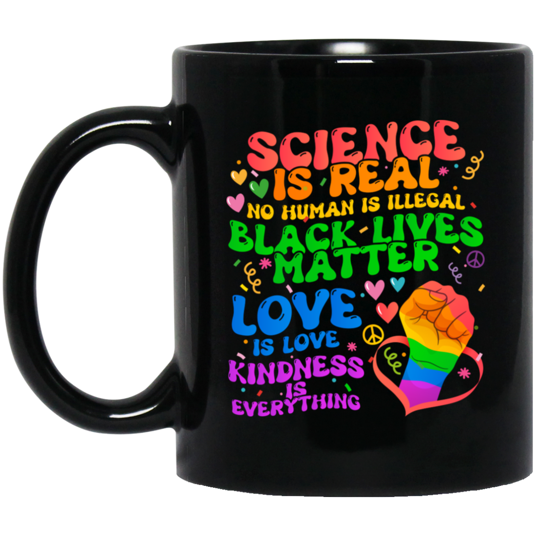 Science Is Real, No Human Is Illegal, Black Lives Matter, Love Is Love, Kindness Is Everything Black Mug