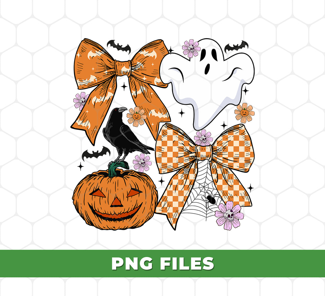 Halloween PNG Bundle, Cute Ghost Pumpkin Crow Sublimation, Orange Bow Spider Web Clipart, Spooky Bat Floral Halloween, Happy Halloween