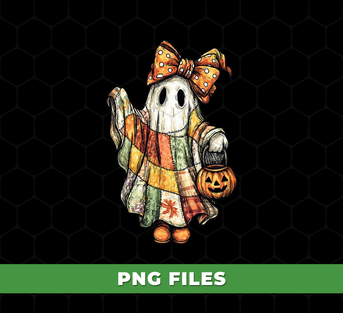 Cute Ghost Halloween PNG, Patchwork Quilt Ghost Clipart, Retro Fall Pumpkin Trick or Treat PNG, Spooky Season Sublimation Design