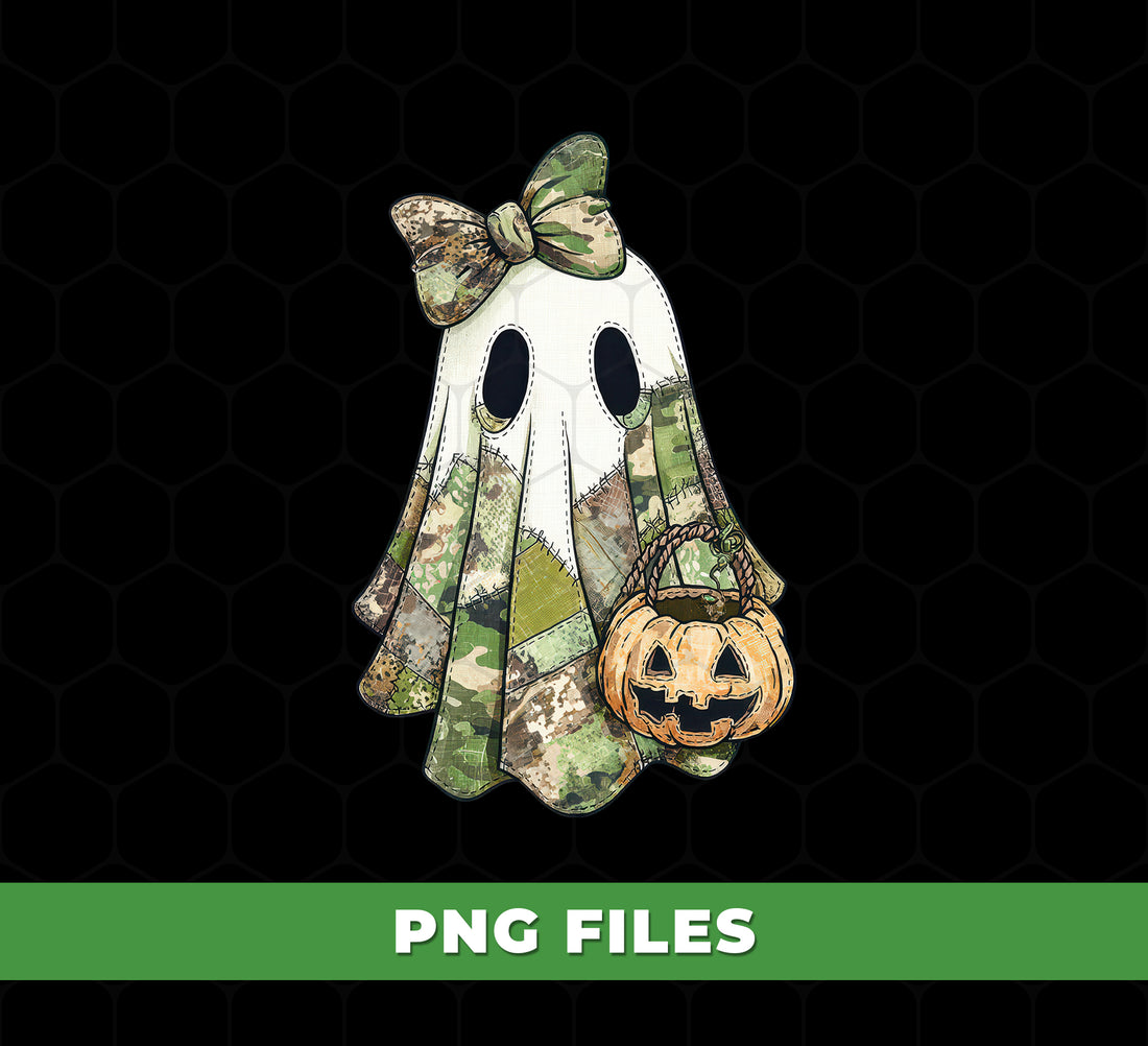 Camo Ghost PNG, Halloween Ghost with Bow and Pumpkin Clipart, Cute Military Camo Sublimation, Spooky Season PNG, Trick or Treat Design