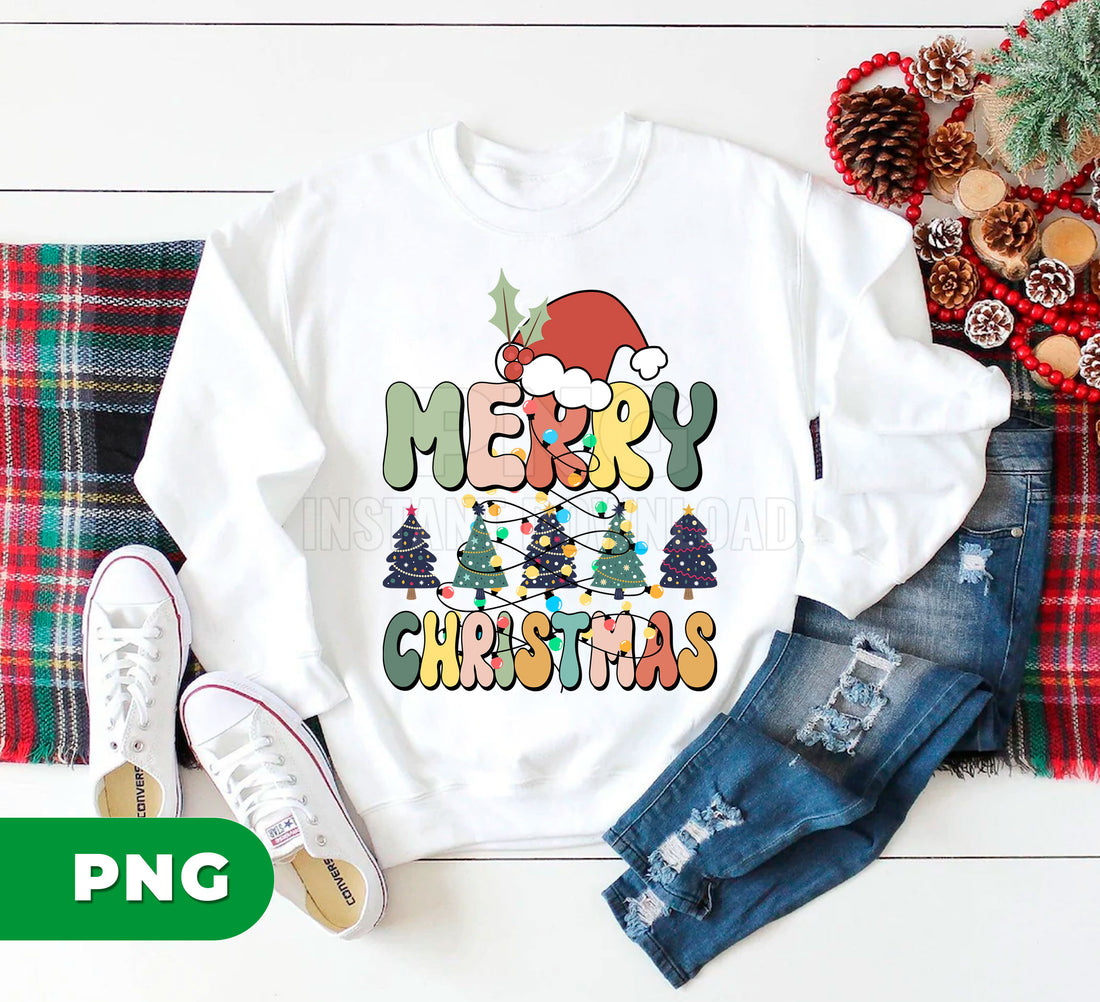 Merry Christmas PNG, Cute Christmas Trees Lights Clipart, Retro Xmas Hat PNG, Holiday Quote Design, Festive Season Sublimation PNG