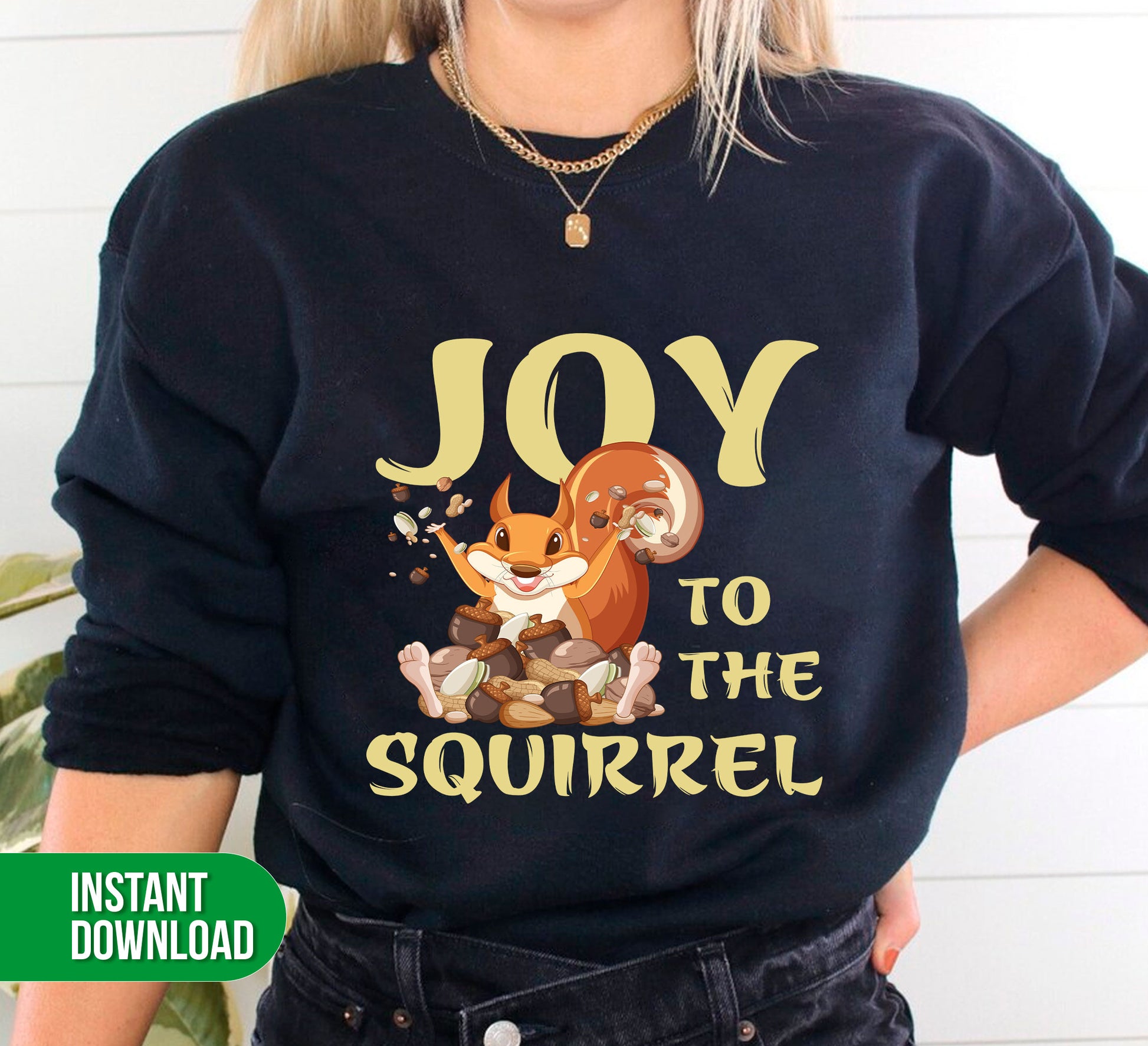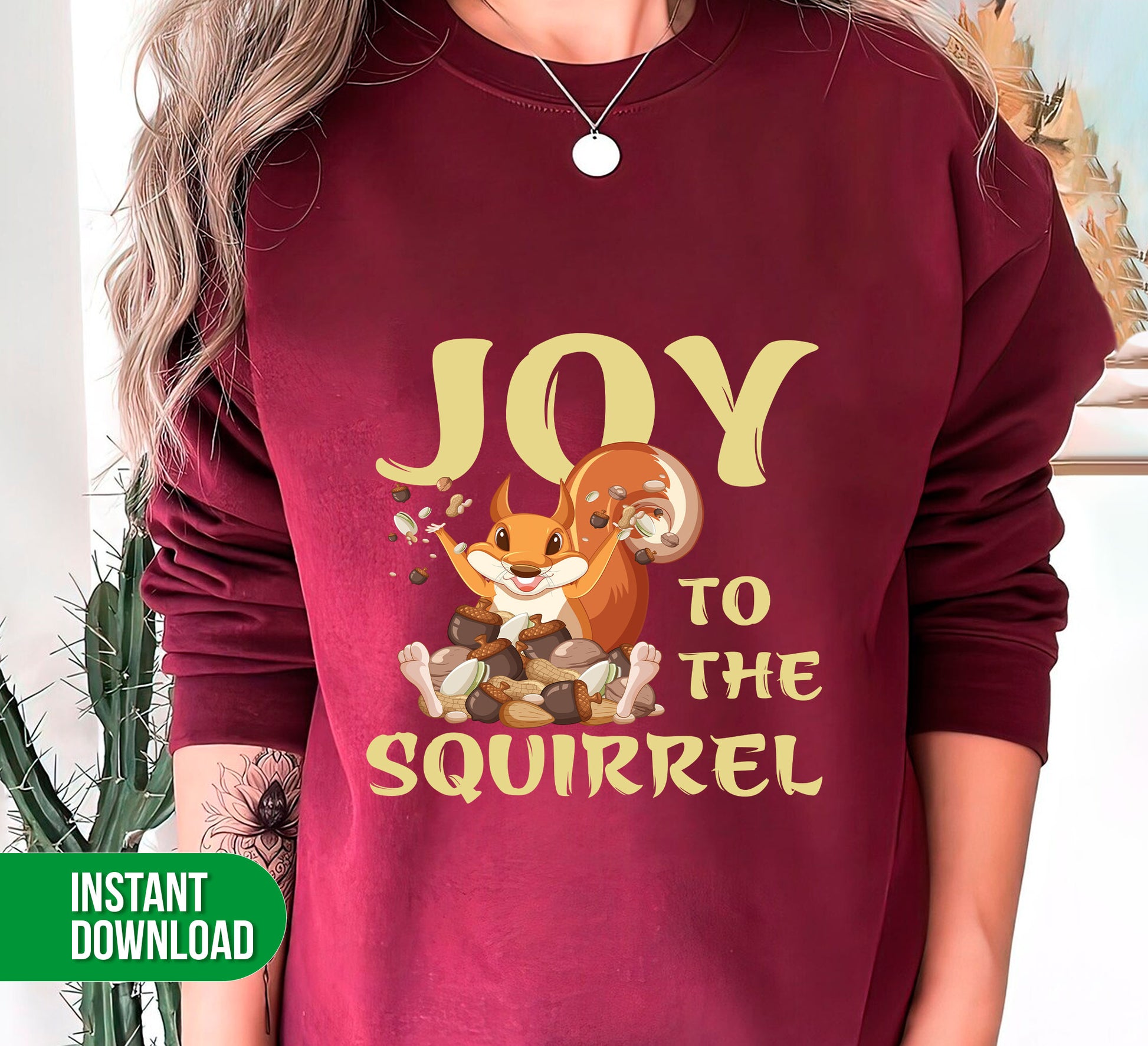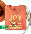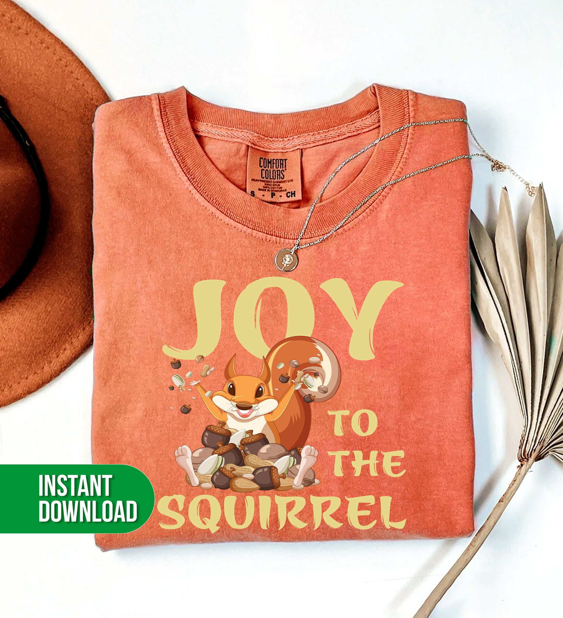 Joy To The Squirrel is a digital file design featuring a Thanksgiving squirrel holding a hazelnut. The files are in PNG format for sublimation printing. Bring joy to your next Thanksgiving gathering with this delightful design.