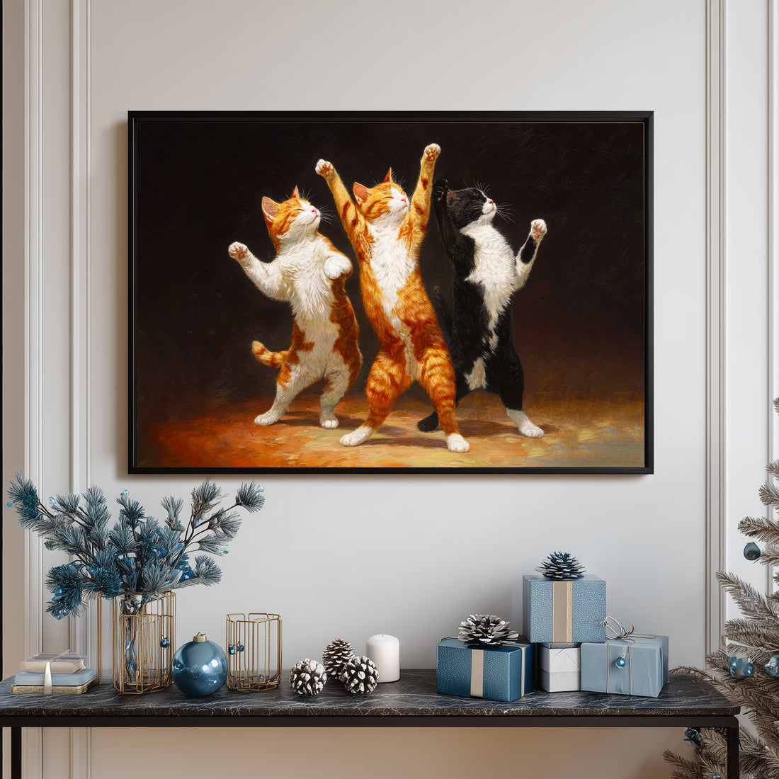 Charming Oil Painting Of Three Happy Kittens Dancing With Paws Raised Against A Dark, Dramatic Vintage Background