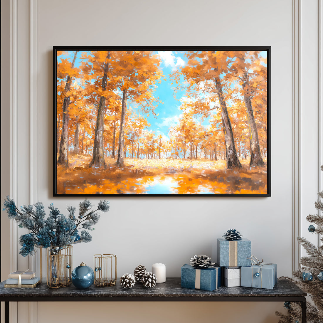 Expressive Oil Painting Of Autumn Forest With Intense Orange And Gold Foliage Under A Bright, Clear Blue Sky