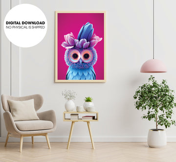 Cute Blue Owl Inside A Tulip In A Pink Coulour Design, Adorable Bird, Poster Design, Printable Art