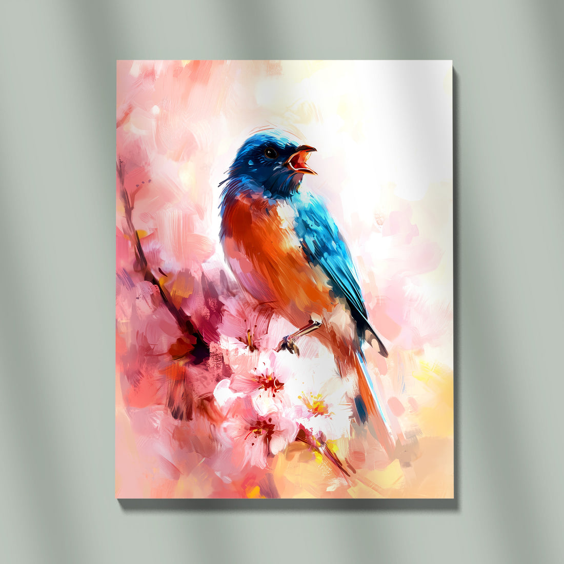 This vibrant artwork showcases a beautifully painted bluebird perched among blooming cherry blossoms, rendered in...