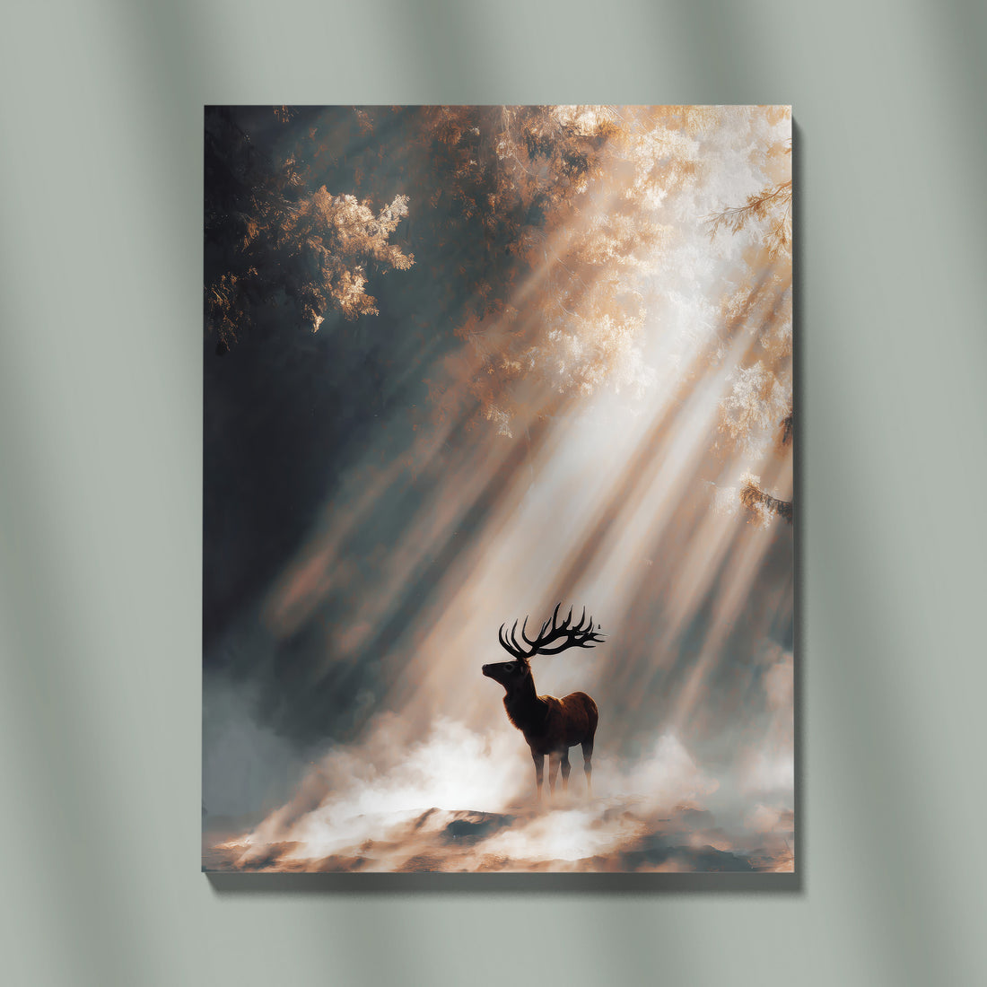 This breathtaking artwork captures a majestic stag standing in a misty woodland as golden light...