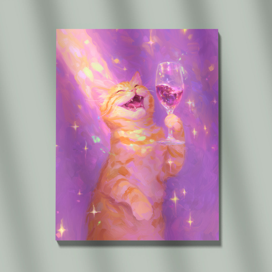 This enchanting artwork features a joyful orange cat laughing blissfully while holding a sparkling wine...