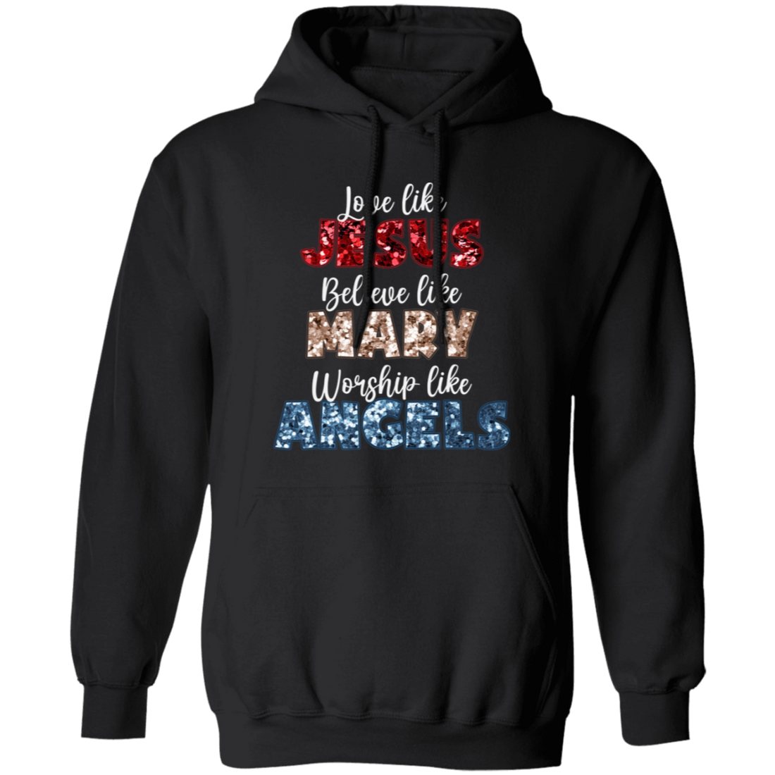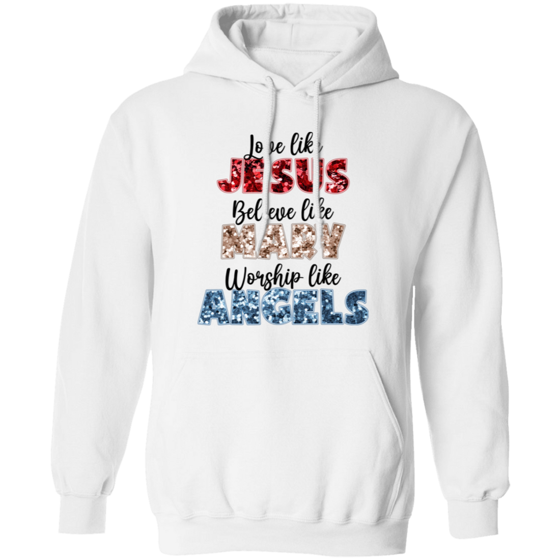 Love Like Jesus, Believe Like Mary, Worship Like Angels Pullover Hoodie