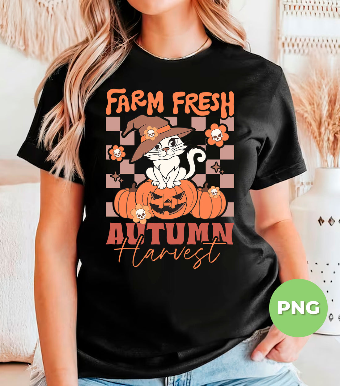 Farm Fresh Autumn Harvest Cat PNG, Witch Hat Cat On Pumpkin Fall Sublimation Design, Cute Spooky Autumn Decor Art, PNG For Shirts, PNG Sublimation Ceramic Mug