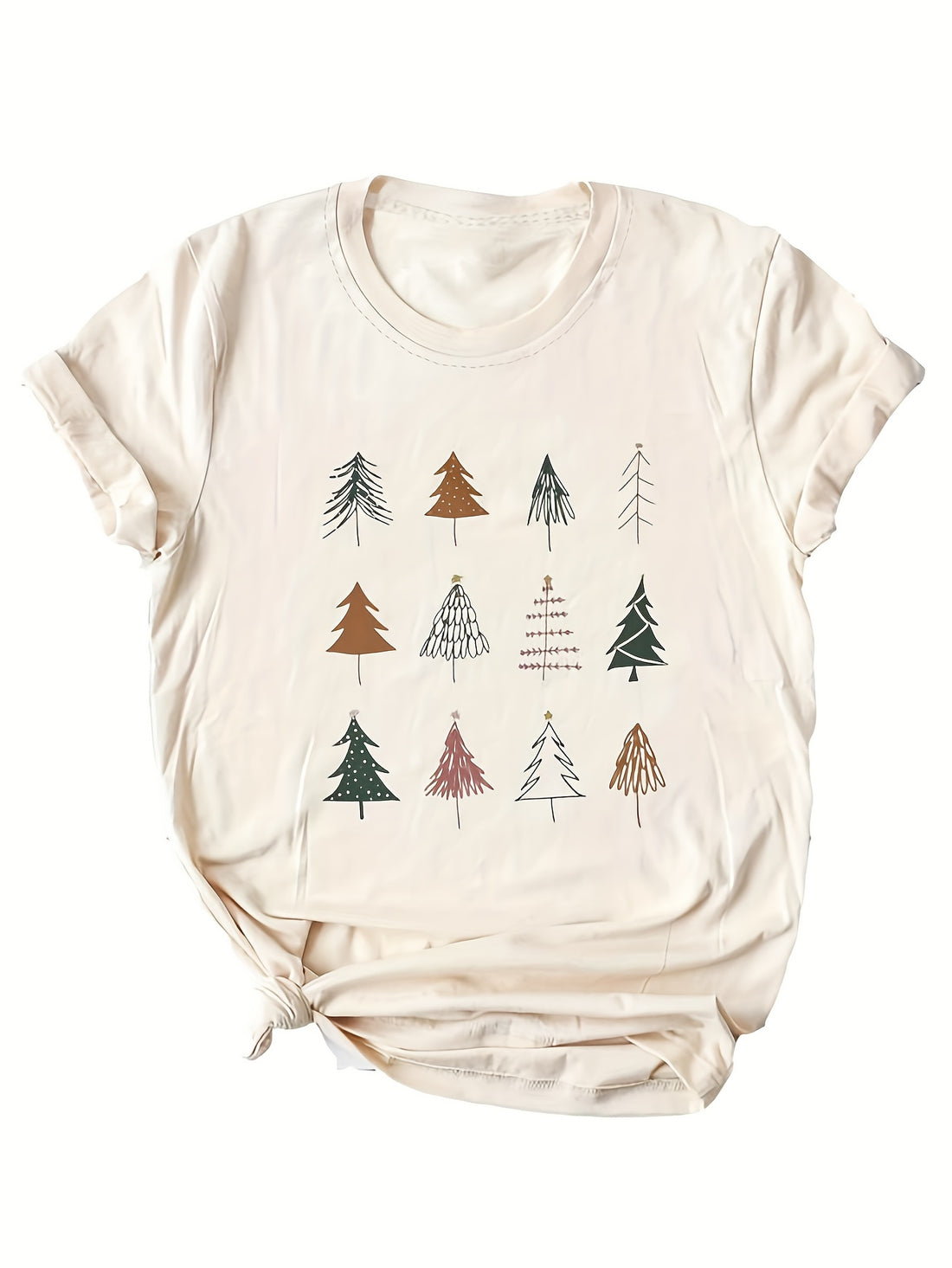 Festive Charm: Women's Christmas Tree Printed Tee - Casual and Comfortable Short Sleeve Crew Neck T-Shirt