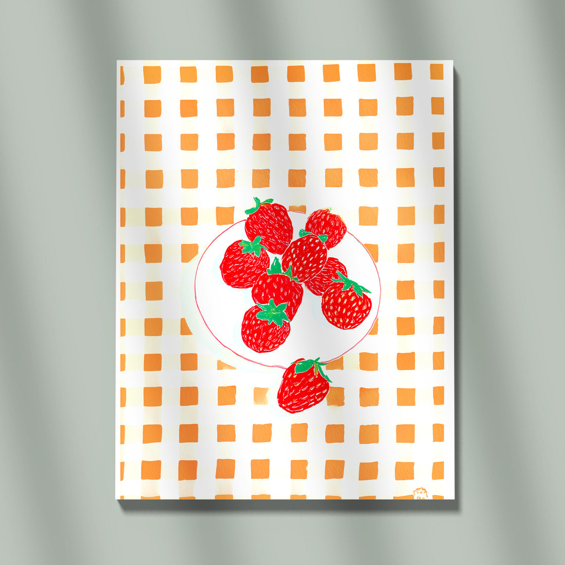 Minimalist Strawberry Illustration On Orange Gingham Pattern Background Modern Pop Art Print