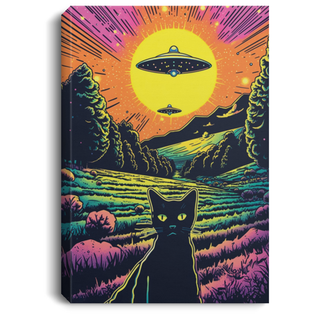 Psychedelic Art Style Of A Cat, Taking A Selfie With UFO Invasion, On The Field Canvas