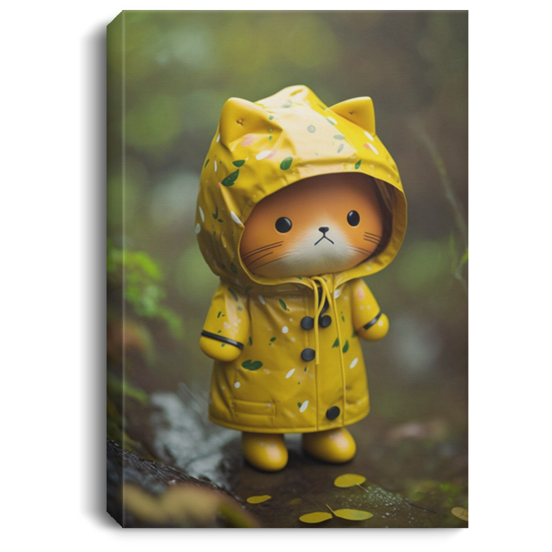 This canvas features a unique, Kawaii Cartoon-style design of a raincoat-clad kitten lost in a...