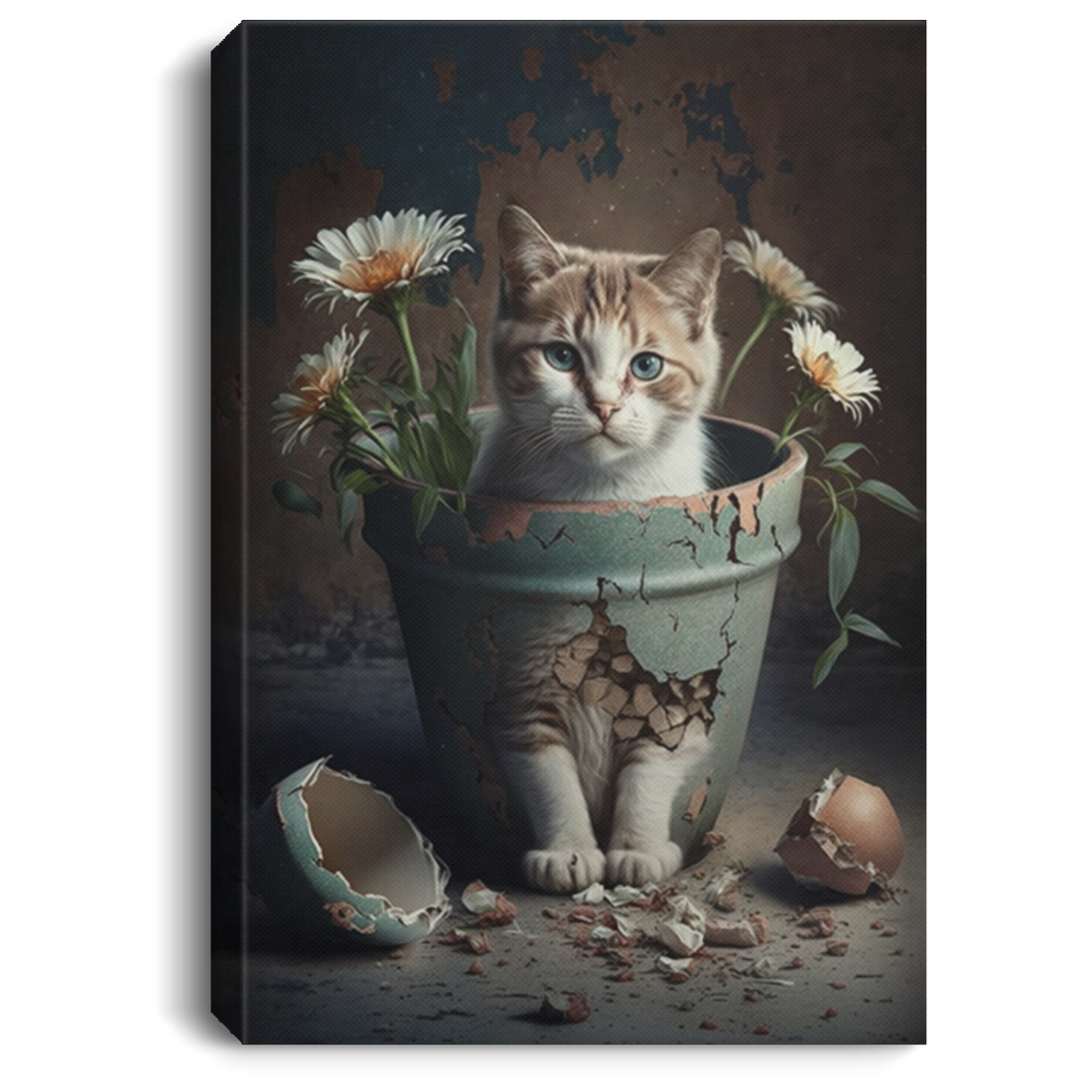 Cute Cat And Broken Flower Pots With Blooming Chrysanthemum