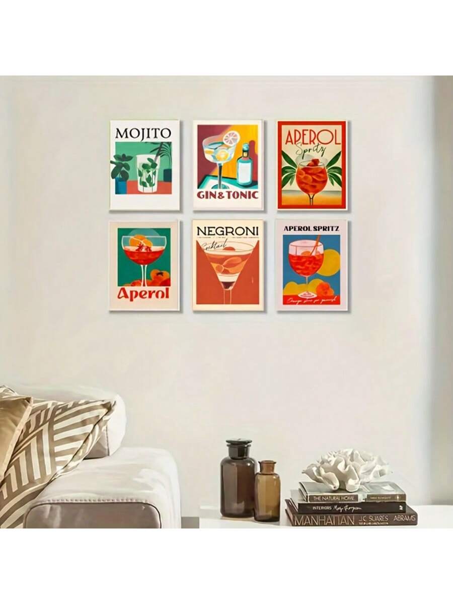 6pcs Set Classic Bar Cart Decor: Trendy Cocktail Poster and Danish Pastel Canvas Wall Art for College Dorm and Bar Parties