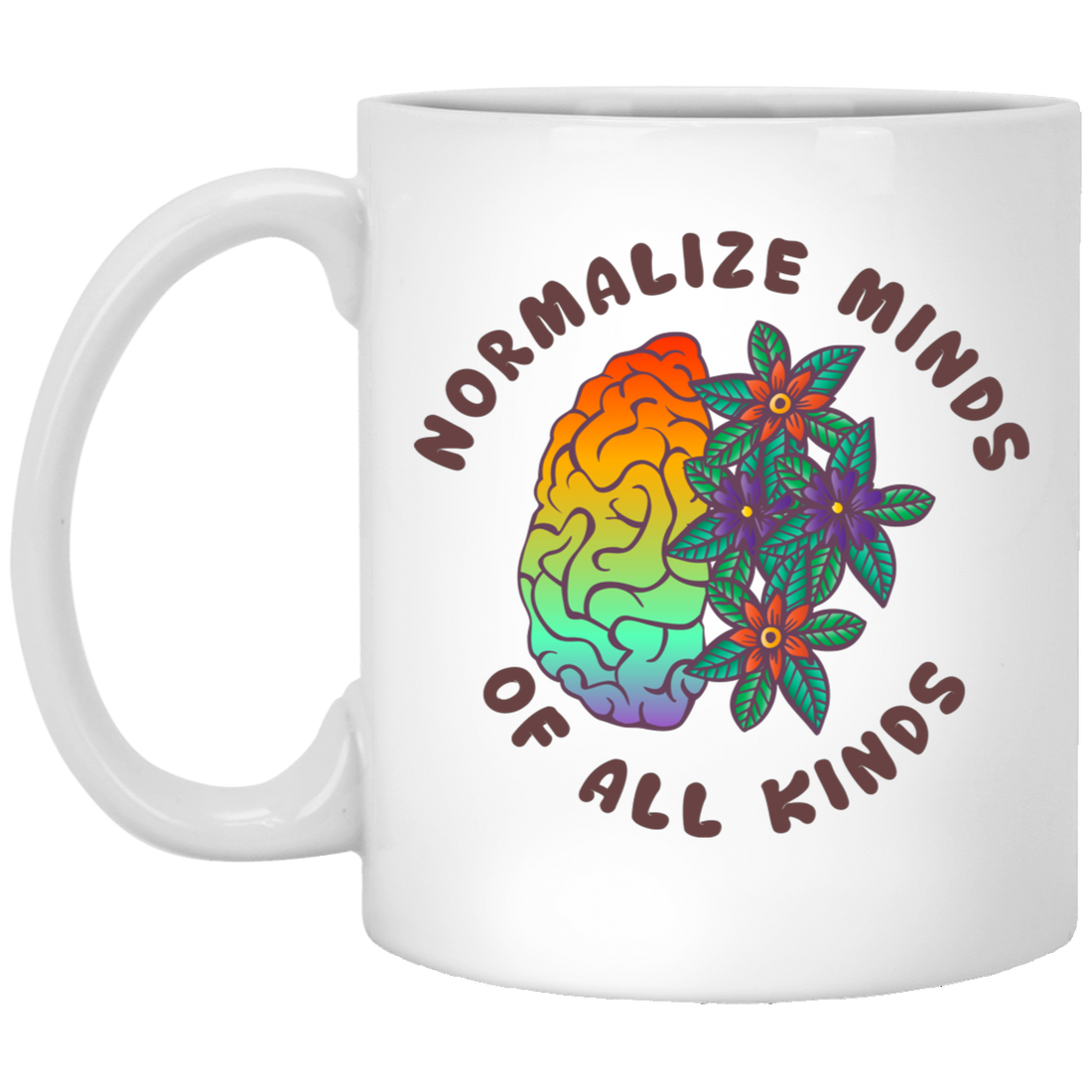 Mental Health, Normalize Minds Of All Kinds, Colorful Brain White Mug