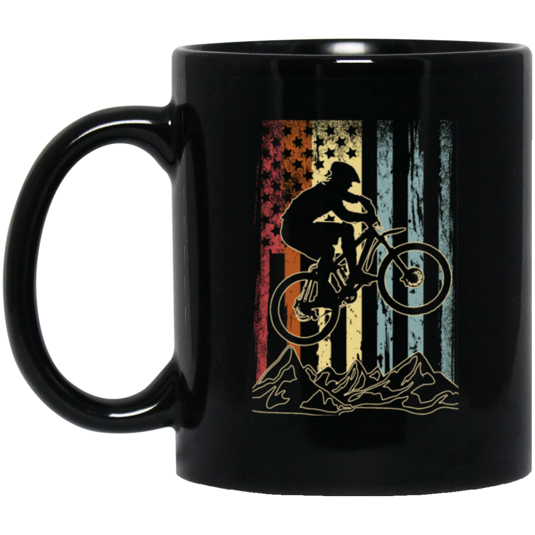Vintage Mountain Bike, Retro Biking, American Flag, American Biker Black Mug