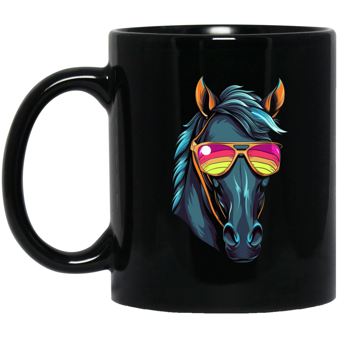 Funny Racing Horse, Horse Wear Sunglasses, Looking Directly At You Black Mug