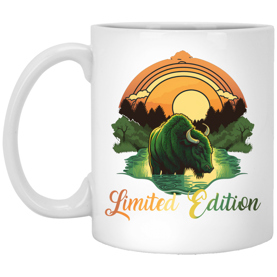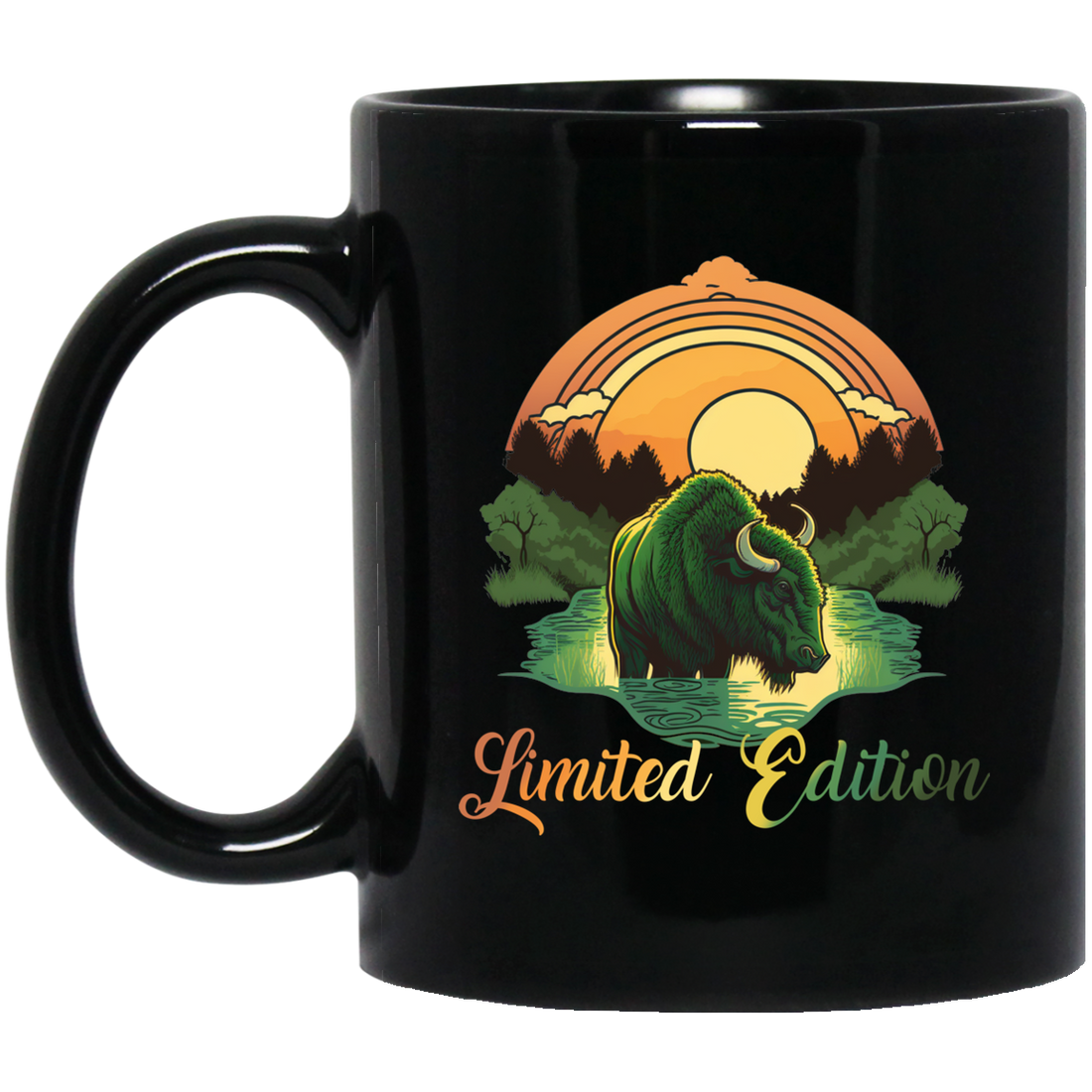 Green Bison With A River, Sunset And Treeline, Love Cow, Cow In Sunset Black Mug