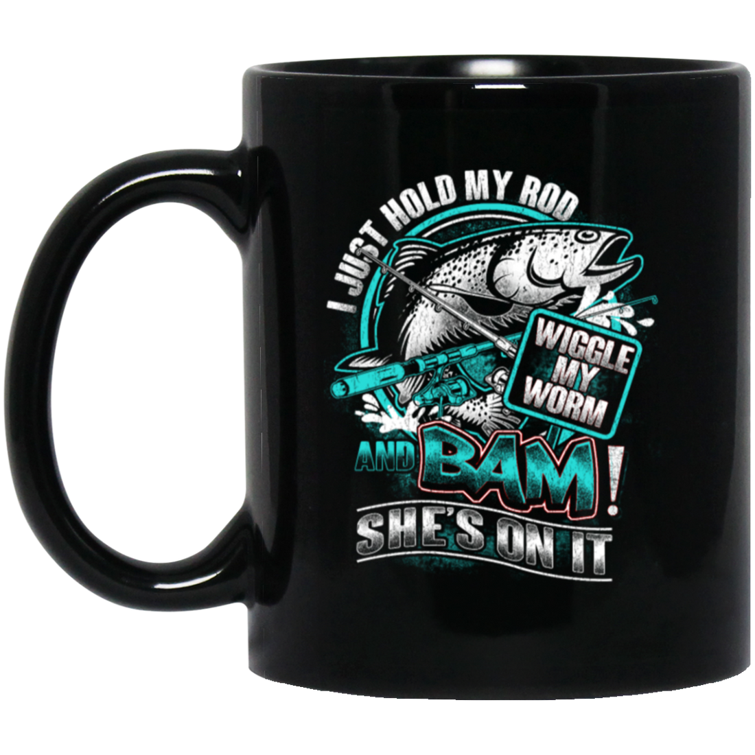 I Just Hold My Rod, And Bam! She's On It, Wiggle My Worm, Love Fishing Black Mug