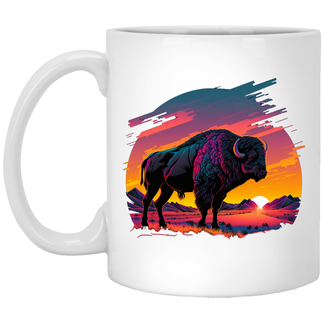 A Bison In Front Of The Sunset, Neon Style, Smooth Lines, Best Of Cow White Mug