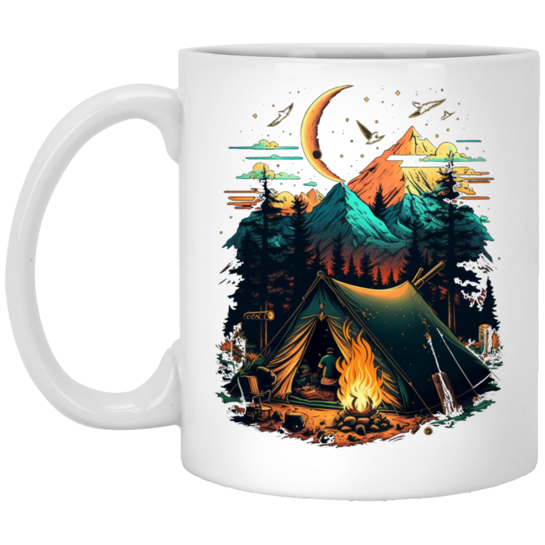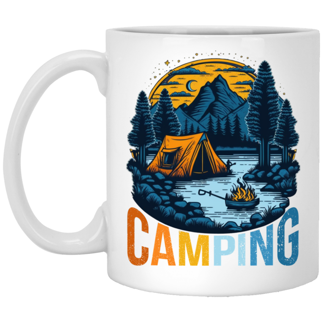 Camping In A Forest, Camping On Lake With Mountain, Retro Style White Mug