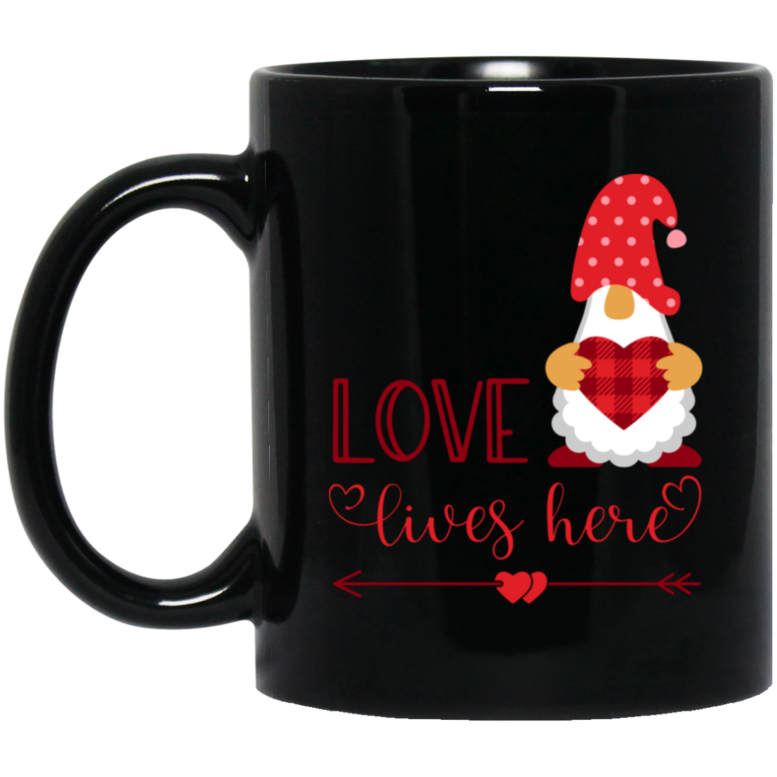 Love Lives Here, Loving Gnome, Cute Gnome, Valentine, Valentine's Day, Trendy Valentine Black Mug