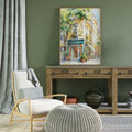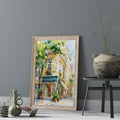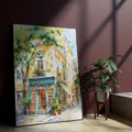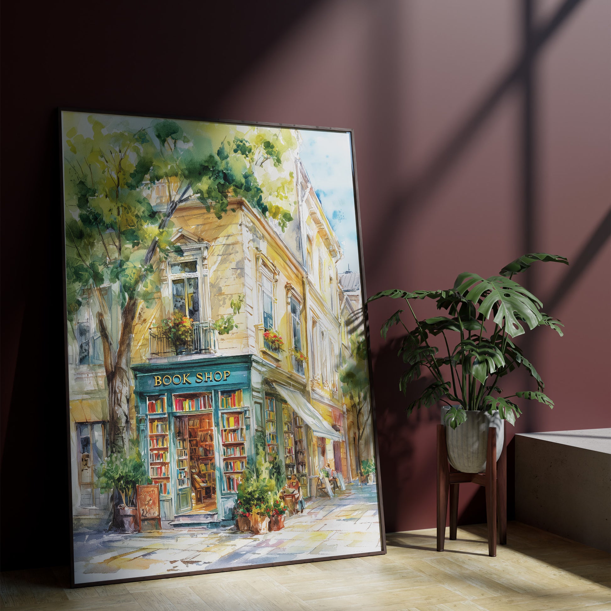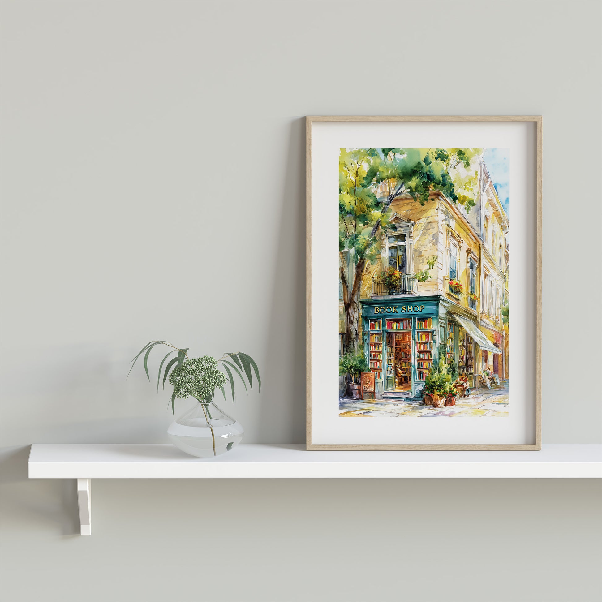 A stunning and vibrant watercolor illustration of a charming, traditional book shop located on a sun-drenched European street. The artwork captures the elegant architecture of a multi-story building with a distinctive teal-colored storefront labeled "BOOK SHOP." Rows of colorful books are visible through the glass windows and doors. The scene is filled with soft, dappled light filtering through lush green trees, creating a warm, inviting, and nostalgic atmosphere. This piece is perfect for book lovers, bibliophiles, or anyone looking to add a touch of classic literary charm to their home or office decor.